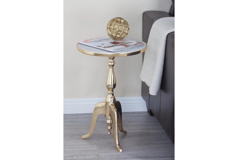 This elegant 15-inch round accent table features a grey marble top with a stunning gold aluminum rim and stand, perfect for adding a touch of sophistication to any traditional decor. The luxurious marble surface is durable and easy to clean, while the sturdy aluminum base provides stability and support.