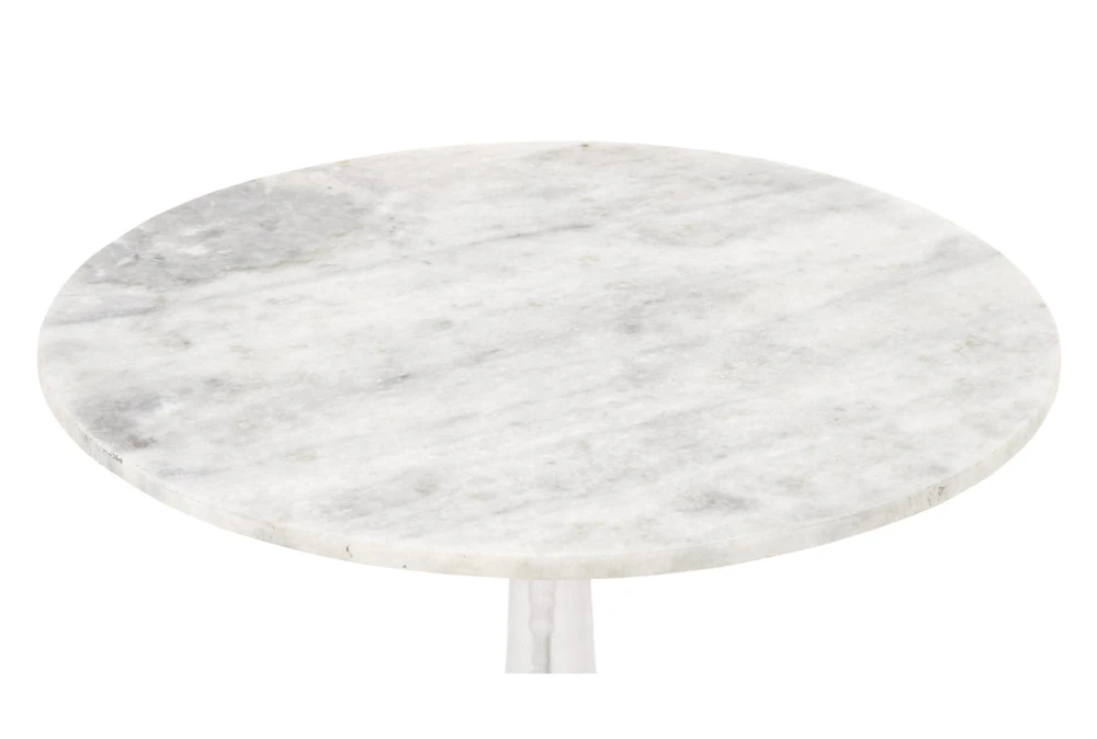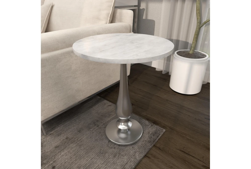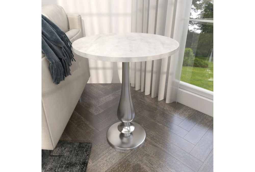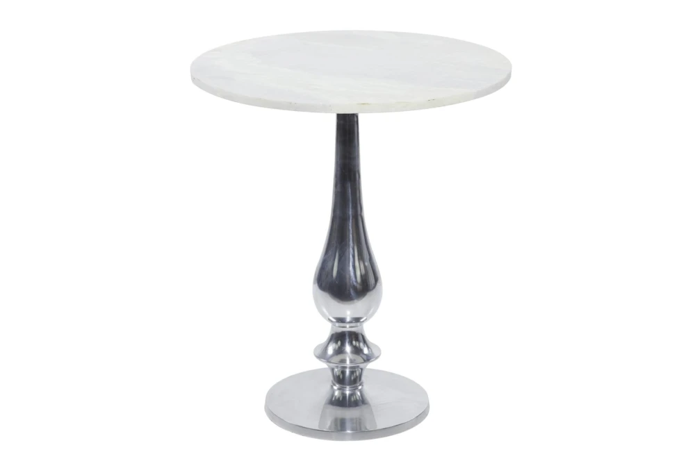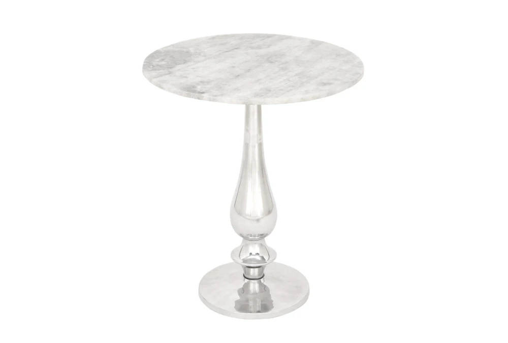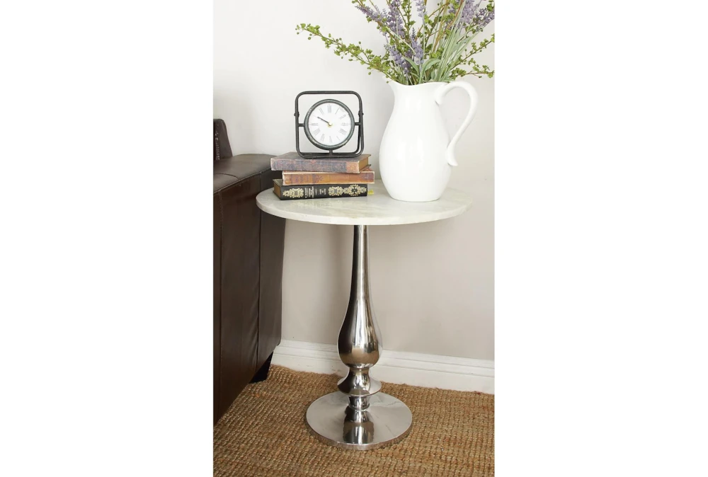 This 20 inch round accent table boasts a timeless design with a smooth marble top and traditional pedestal base. Made of solid aluminum and finished in silver, it adds a refined touch to any space.