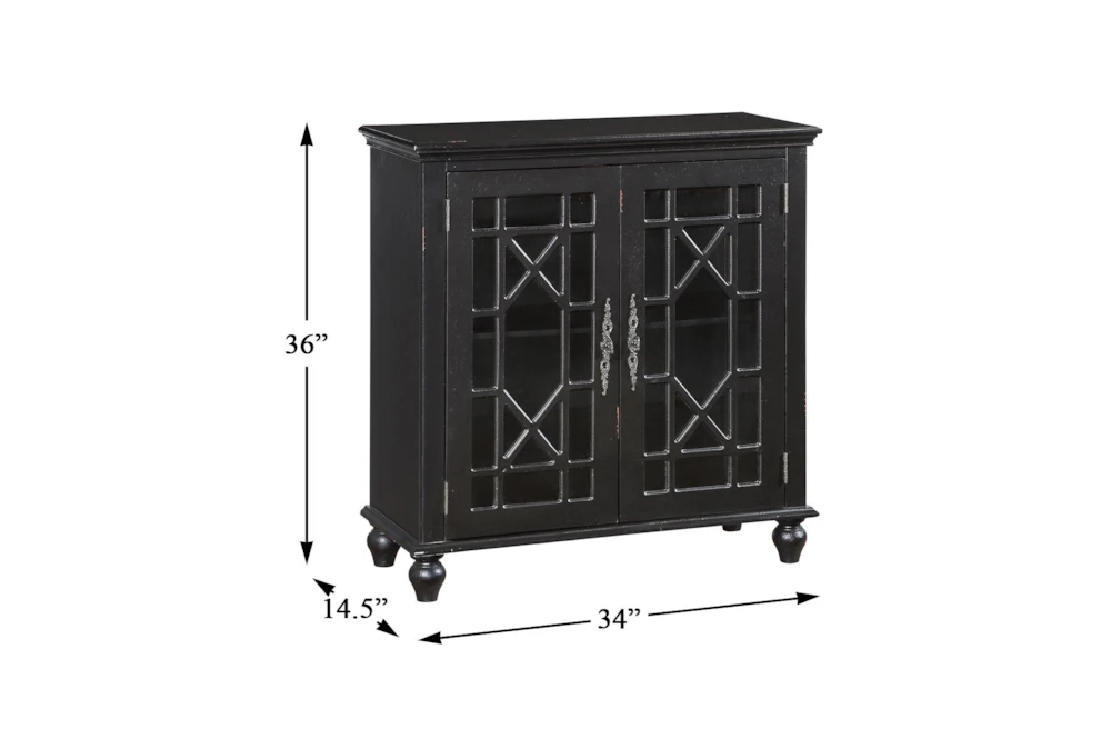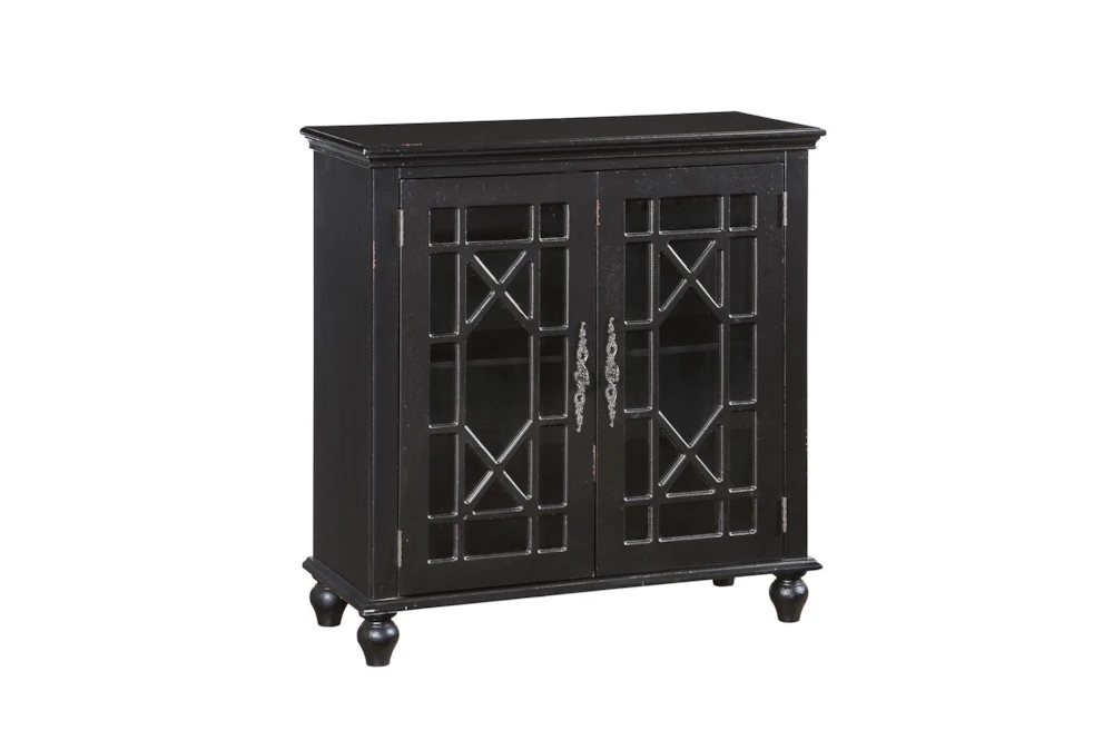 This traditional-style accent cabinet is made of wood and engineered wood in an antique black finish, featuring two cabinet doors with glass inlays and one interior shelf, adorned with antique brass tone mock key knobs with back plates. Assembly is required.