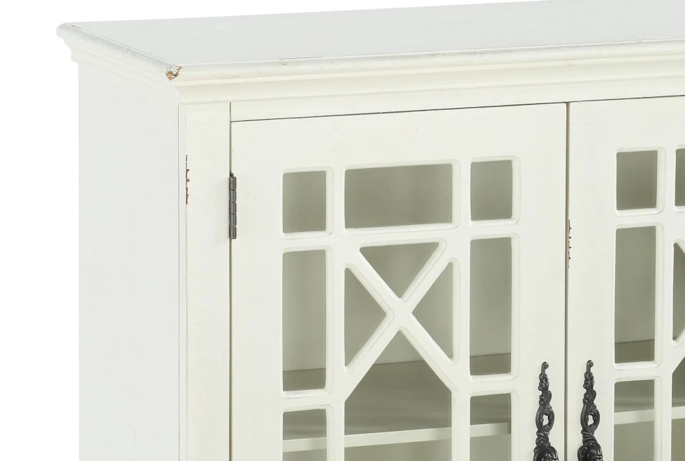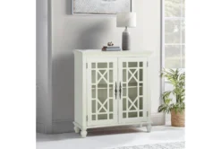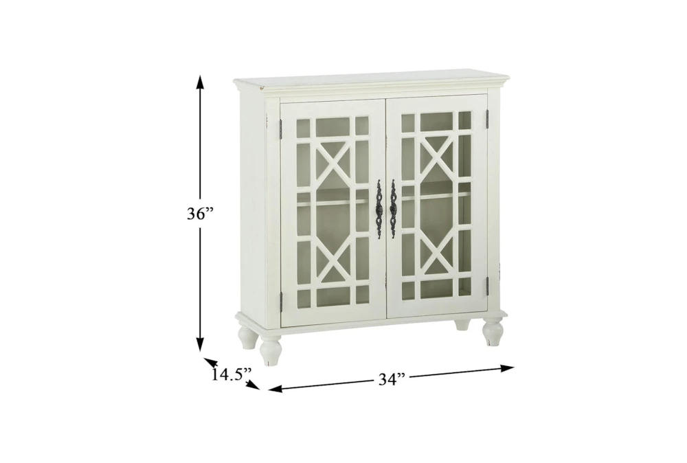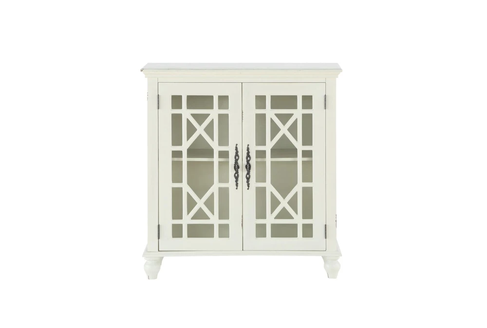 This traditional style accent cabinet is crafted from wood and engineered wood materials in an antique white finish, featuring two cabinet doors with glass inlays and antique brass tone mock key knobs with back plates. Assembly is required, and the piece includes one interior shelf for storage.