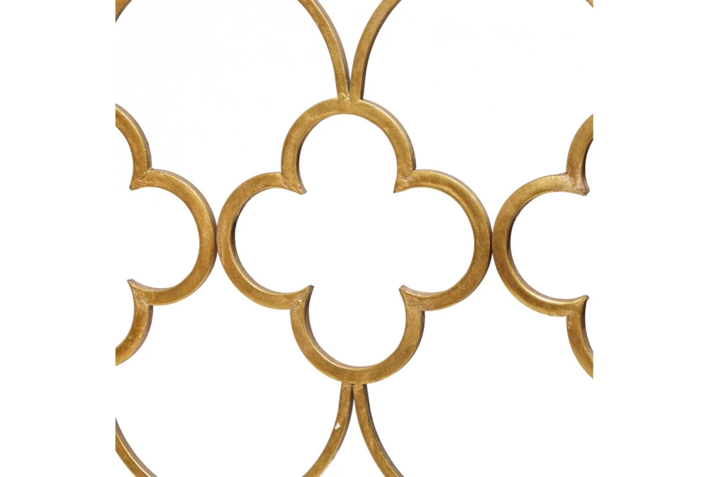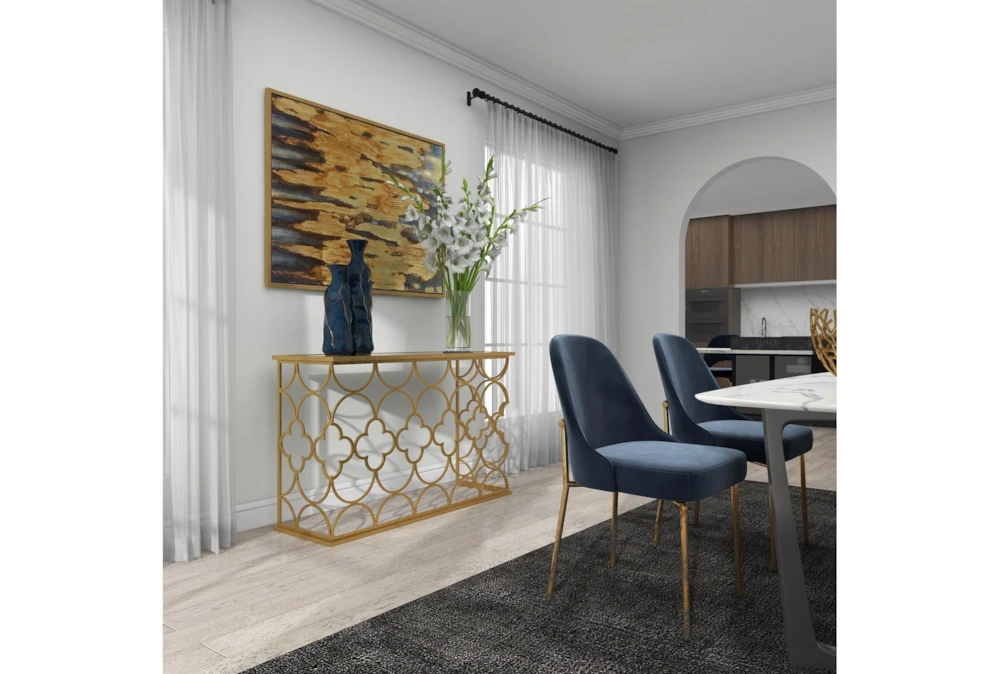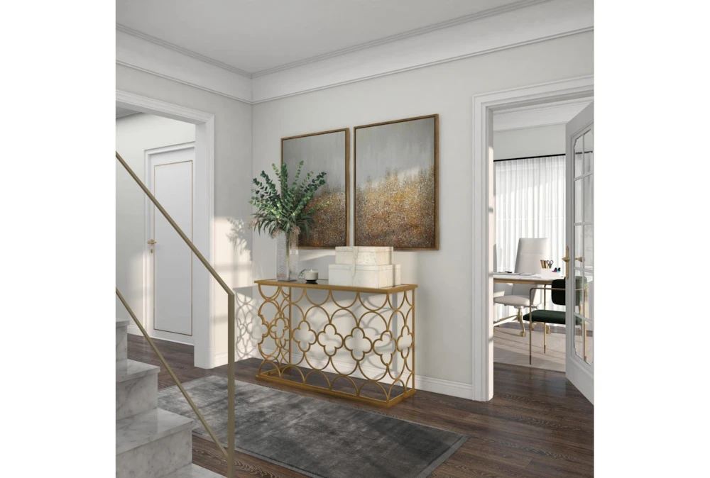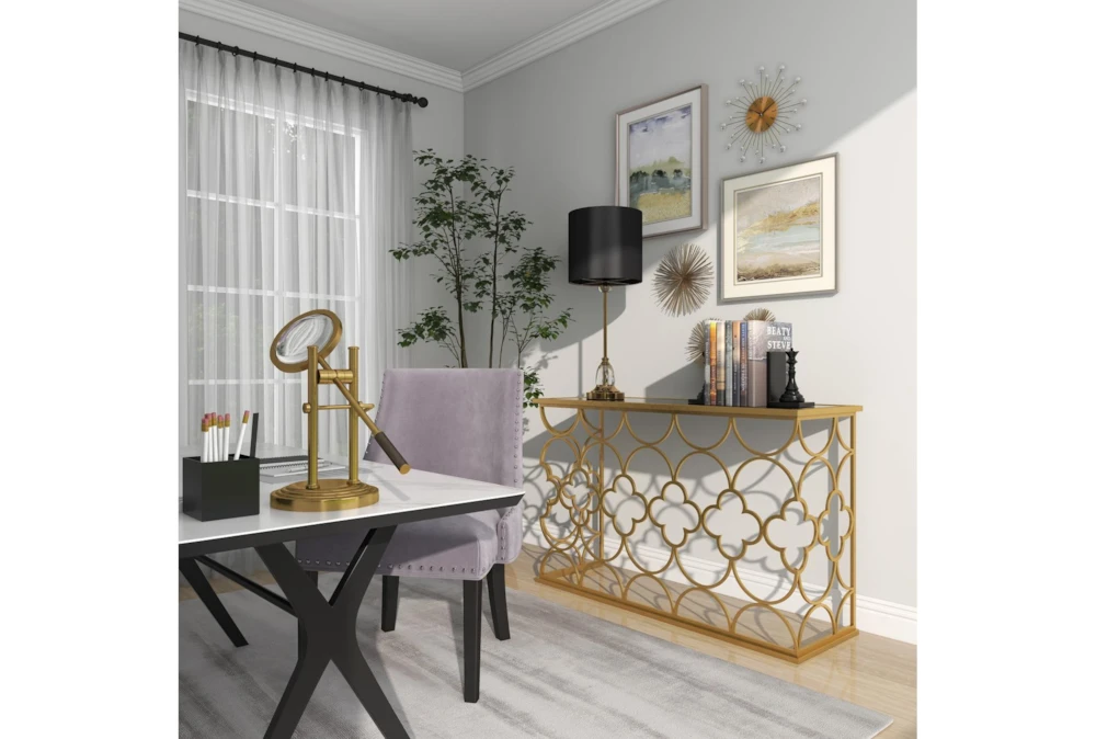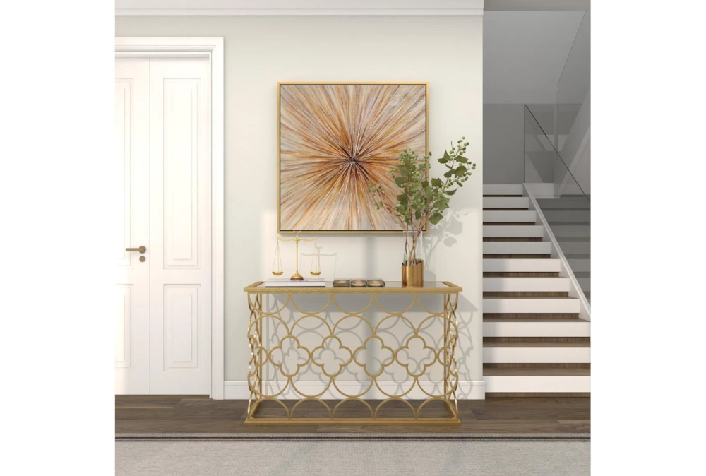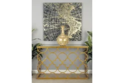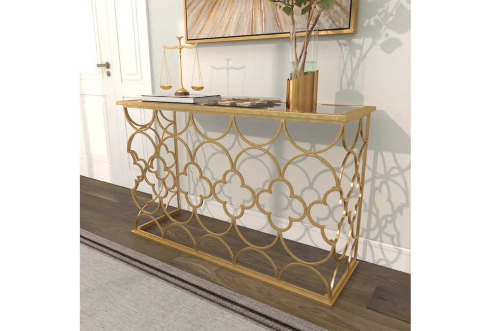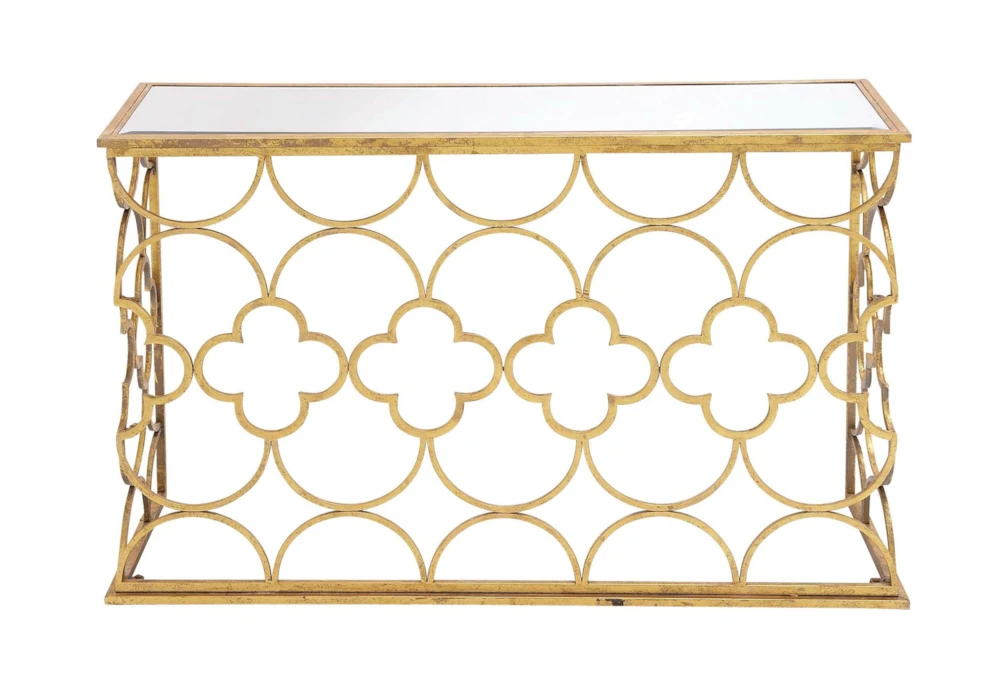 49X31 Gold Iron Console Table is a traditional-style piece that elevates your living space with a touch of luxury. Crafted with solid iron and a reflective tinted mirror, it features a high sheen overall gold finish and a circle and cross iron body mesh for a striking effect. Assembly is required.