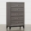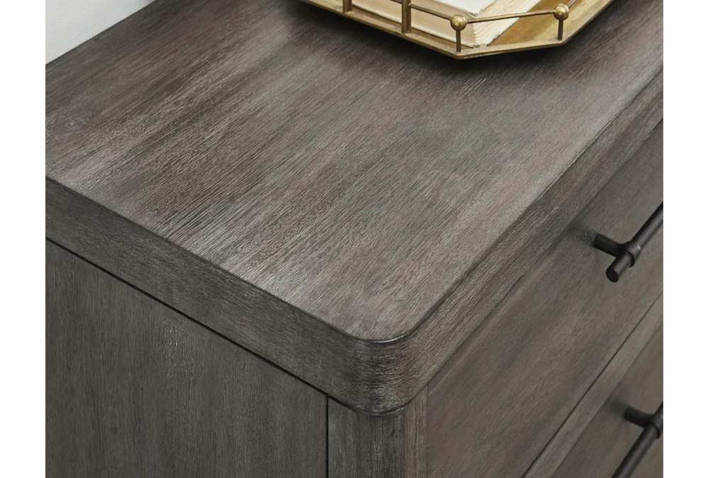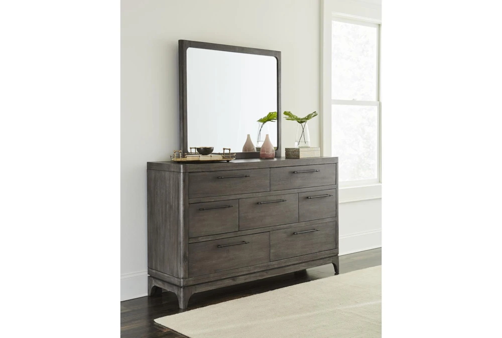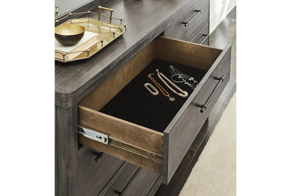 The Aberdeen 7 Drawer Dresser is a contemporary piece made of wood, colored in grey, slate grey, and acacia. Its seven drawers are designed with side metal glides and dovetail drawers, and the top drawers are lined with felt.