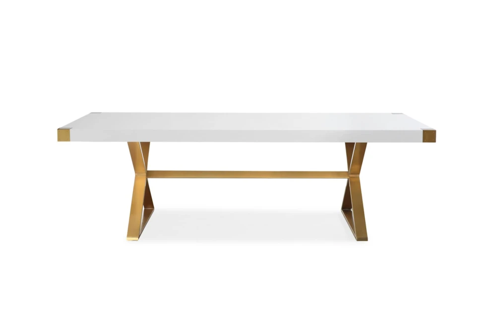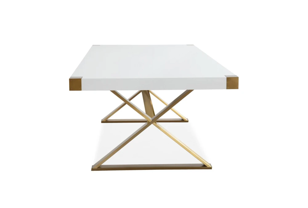 The Adeline White Lacquer 95 Inch Dining Table is a modern piece of furniture made of wood that is perfect for your dining room. It features a high gloss lacquer finished top in black or white, raised gold steel corners, and is handmade by skilled furniture craftsmen using MDF.