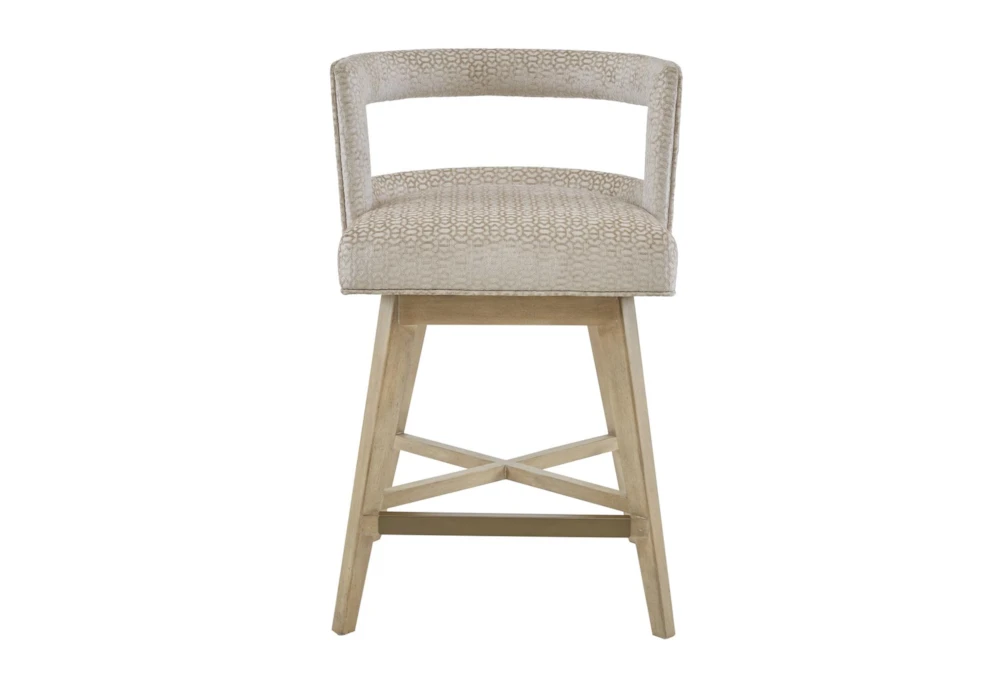 This Adrian 25″ Swivel Counter Stool is a contemporary style stool made of solid wood and polyester with a cushioned seat, swivel feature, and metal kickplate. Assembly is required and the stool comes in a natural wheat color with a bronze metal finish.