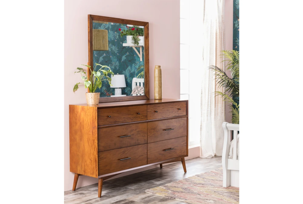 Get your beauty rest in a bedroom that looks cool yet relaxed. From tapered legs and understated hardware to a sleek profile, this dresser/mirror boasts timeless mid-century flair. Solid hardwood and veneer construction reinforces sturdiness, while a cherry finish enhances its warm, casual charm.