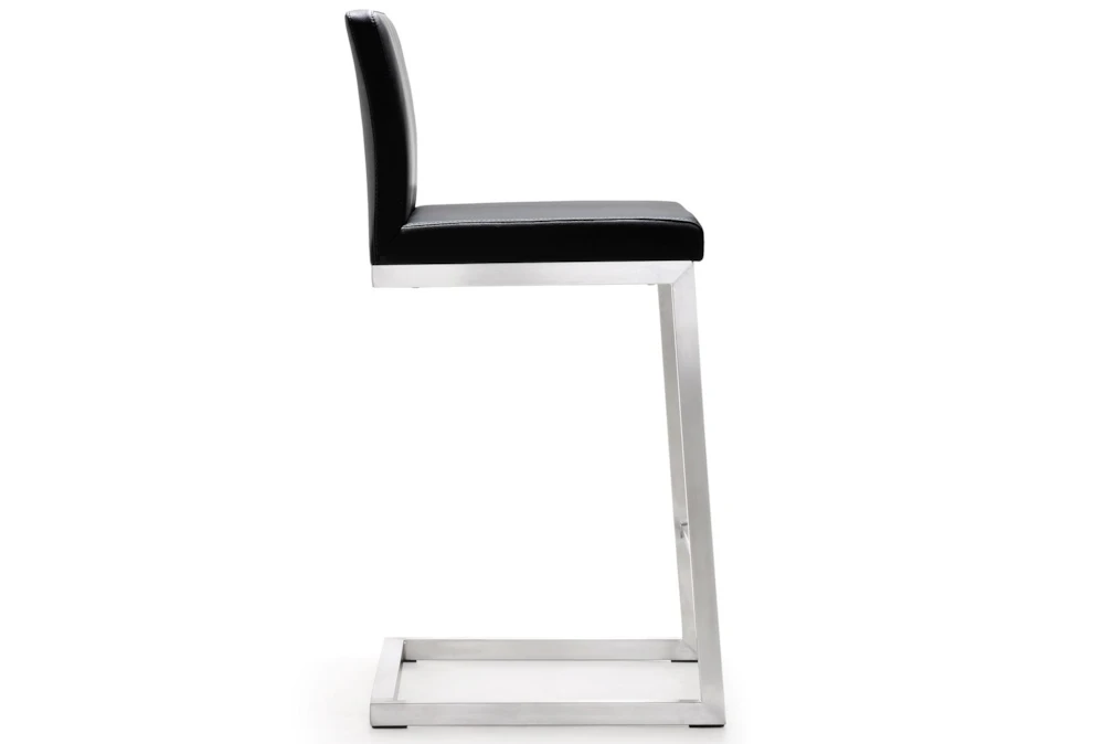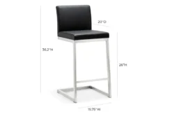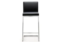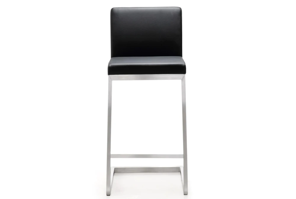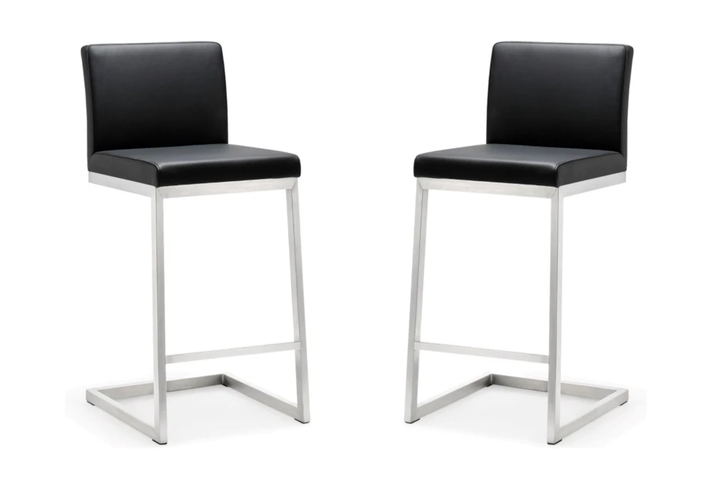 The Amy Black Stainless Steel Counter Stool Set Of 2 is a stylish addition to any modern dining room, featuring a sleek stainless steel frame and footrest with a comfortable vegan leather upholstered back and seat. These tall armless stools come in a set of 2 and ship fully assembled for your convenience.