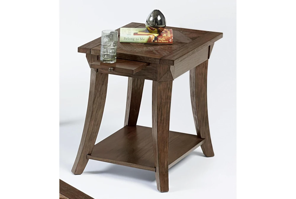 The Appeal L Chairside Table is a traditional wood table in a brown color, perfect for any living room. This compact table requires assembly and is made of poplar solids and veneers, MDF, and particle board, finished in a dark poplar shade.