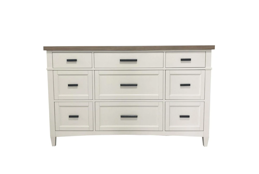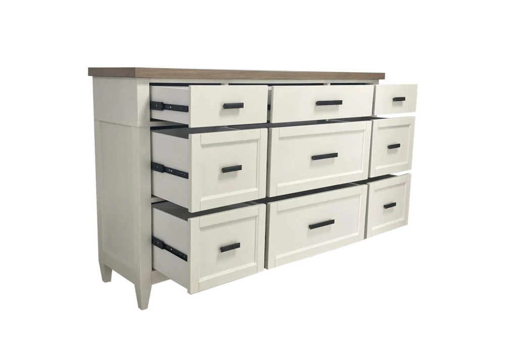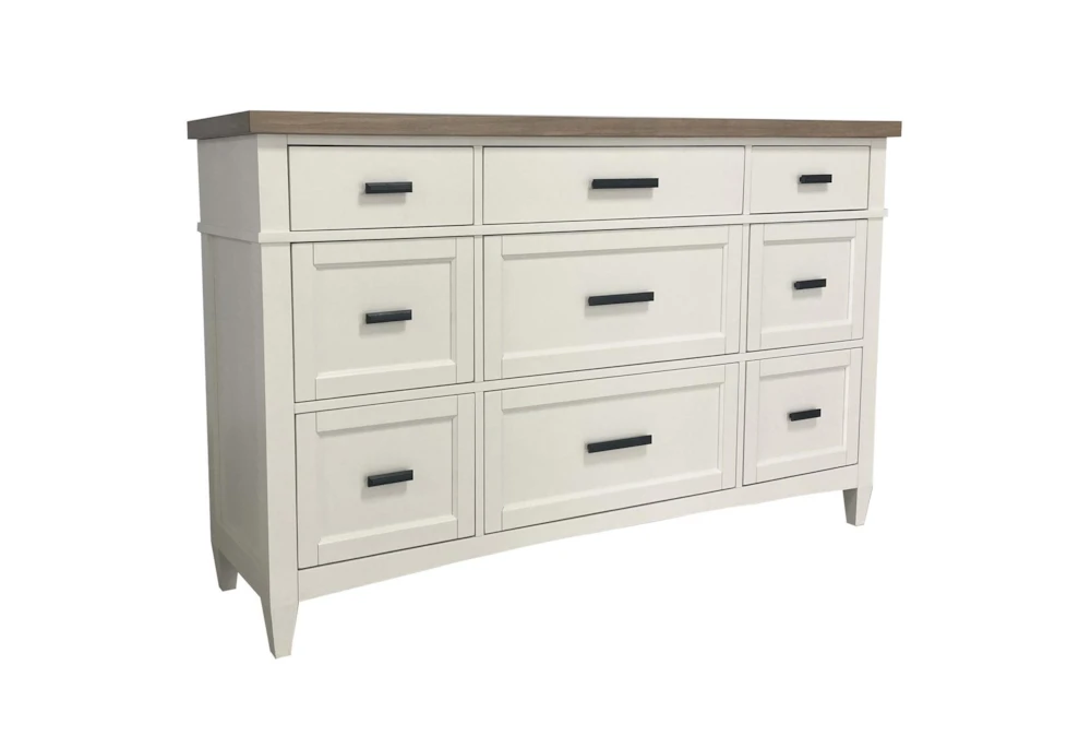 This 9-drawer dresser is made of wood with a white finish and comes fully assembled. Its casual style makes it a perfect fit for any bedroom.