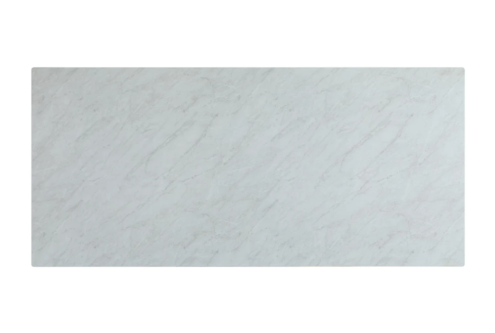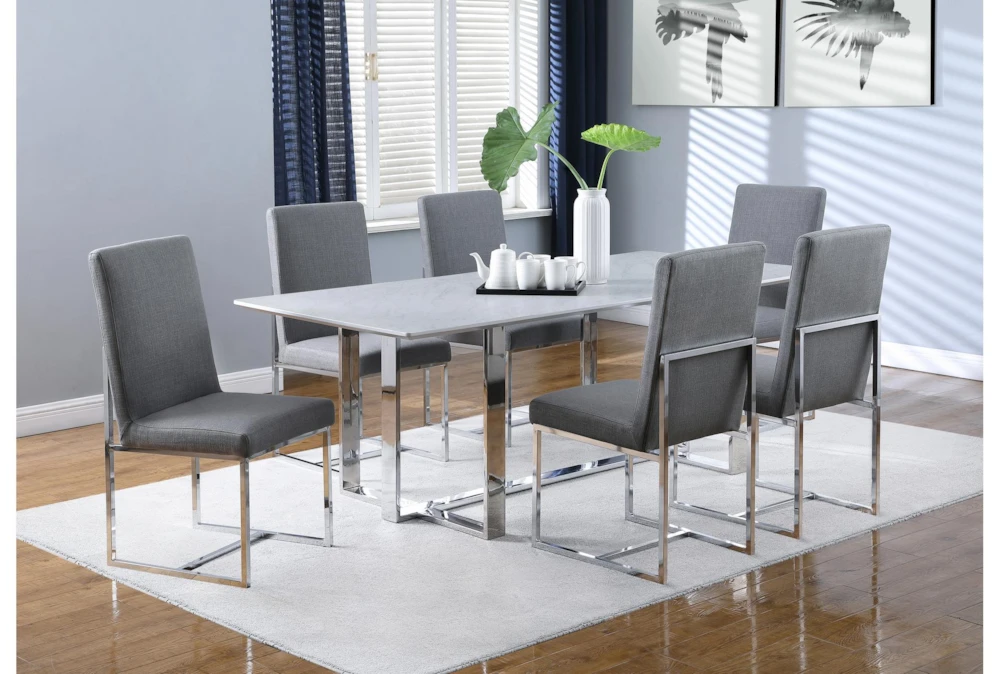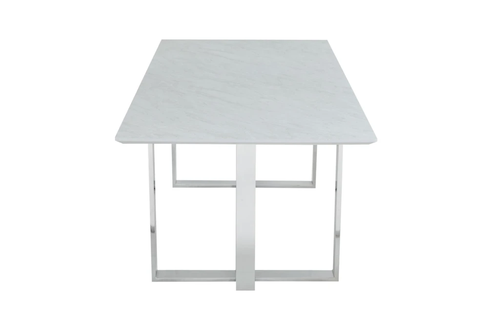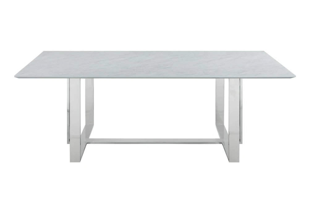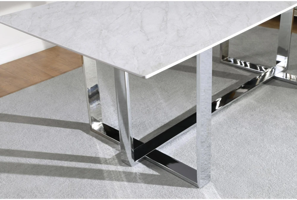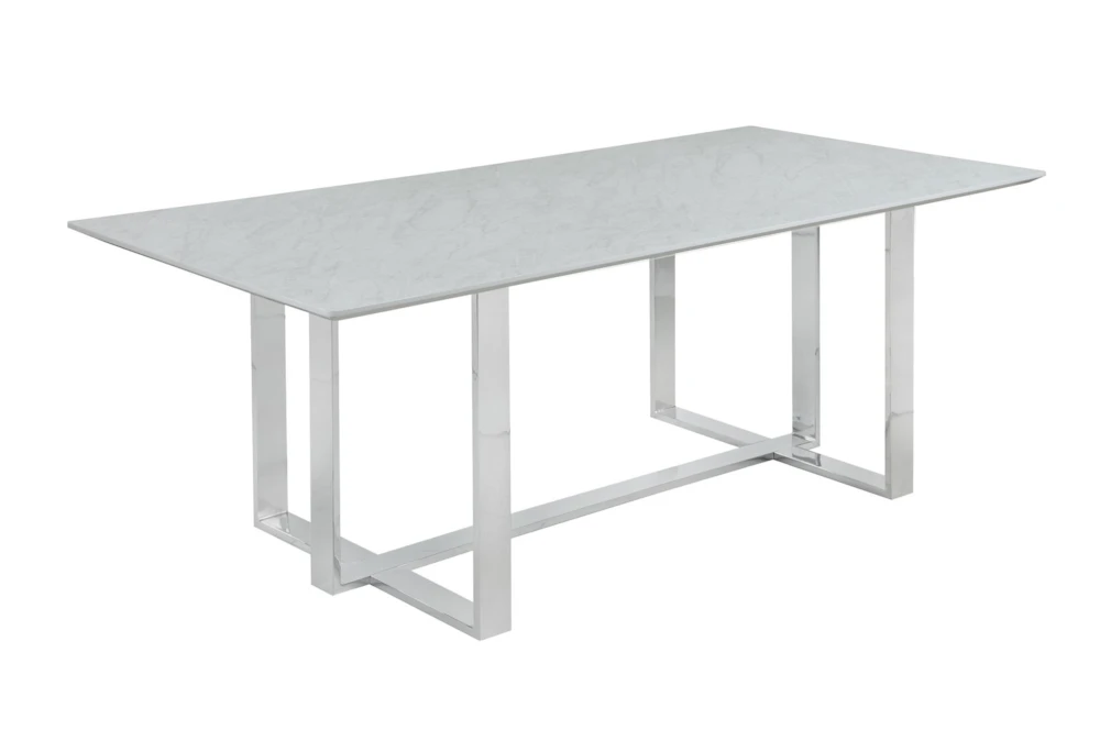 The Ashlynn 82 Inch Dining Table is a modern piece of furniture made of tempered glass and metal, with a sleek white and chrome design. The set includes one dining table, and the table top is made of thick, tempered glass with special technology, creating a faux marble look.