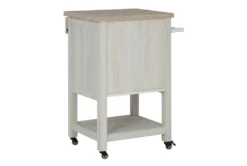 Bar Cart. Constructed of Engineered Wood in Antique White Wood Grain Printed Paper. Light Wood Grain Printed Maleamine Top. 1 Door, 1 Drawer, 1 Shelf, Towel Bar and Casters.