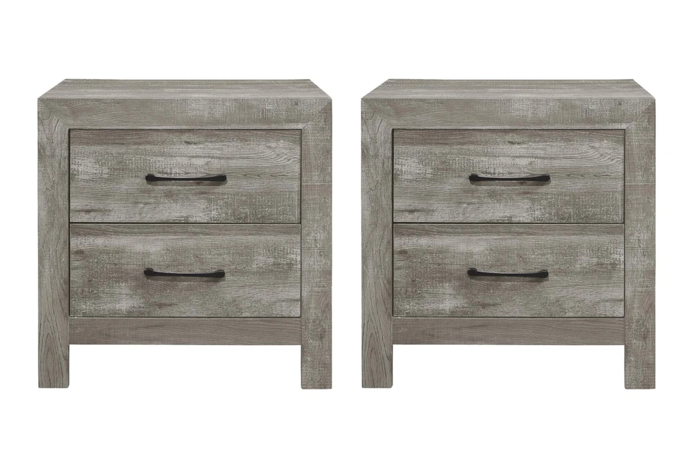 The Barret Grey Nightstand Set includes two rustic wood nightstands with storage and drawers, perfect for any bedroom. Assembly is required and each nightstand features two dovetail drawers with metal on metal center glides and black nickel tone bar pulls.