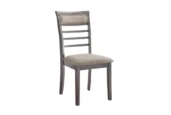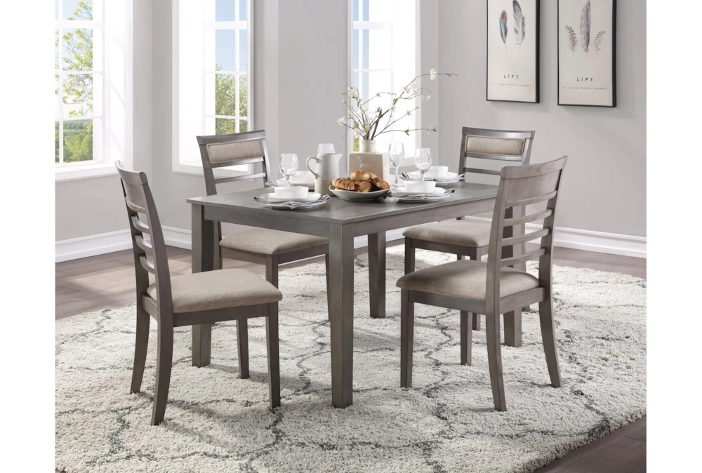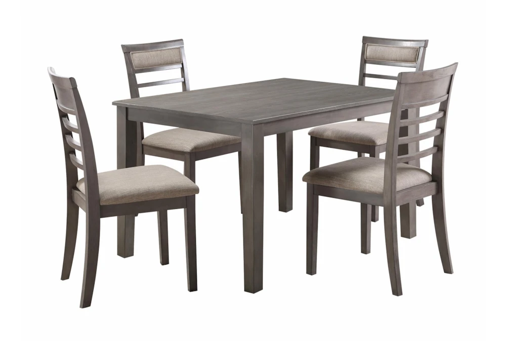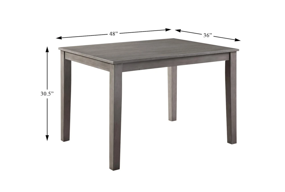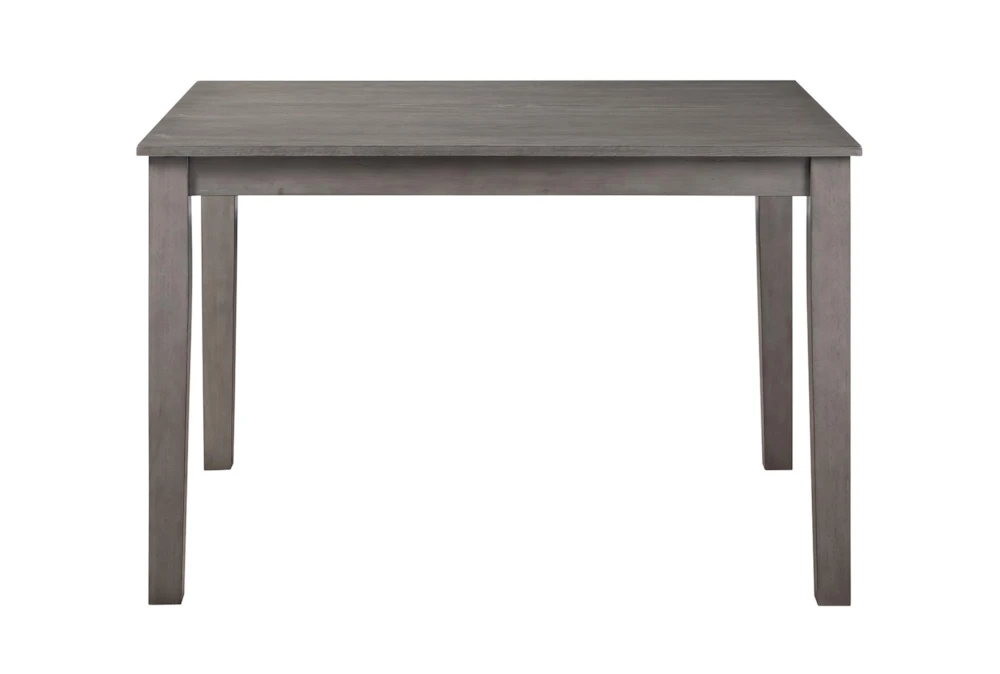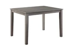 The Becky Counter Set for 4 is a casual addition to any dining room, featuring a tall table and armless stools with slat backs, all made of wood and dolomite materials. Assembly is required for this grey set that includes a dining room table and 4 chairs, perfect for seating a group of four.