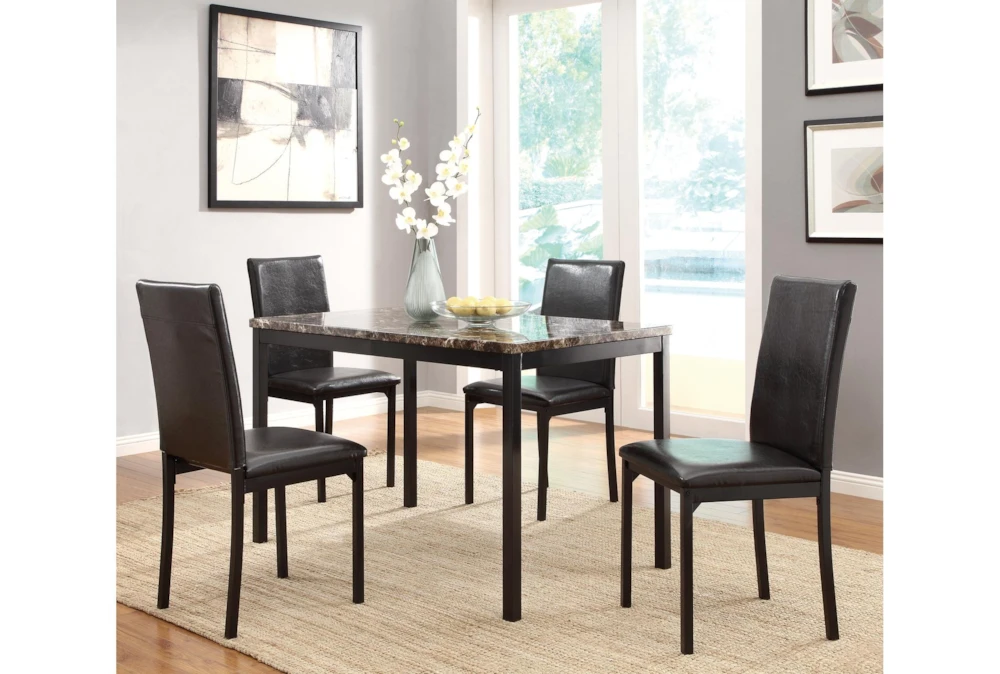 The Bianca Brown Dining Side Chair Set offers a casual style and features armless chairs made from metal with a 2-tone brown and black finish, faux leather seats, and requires assembly.