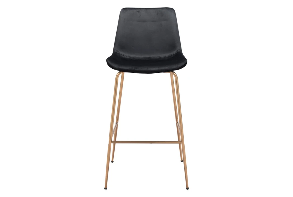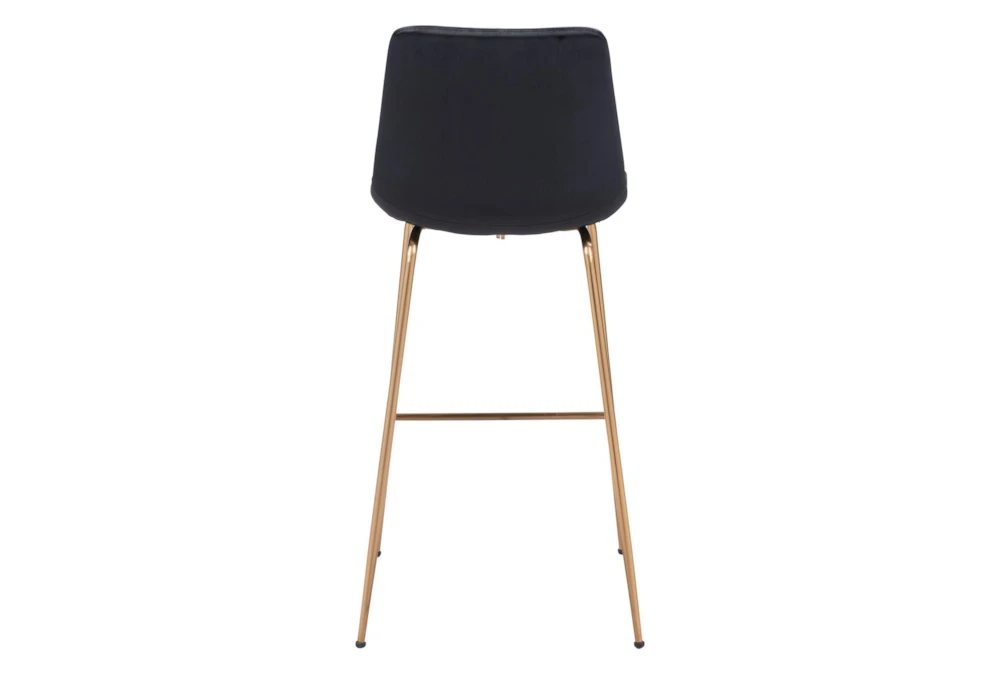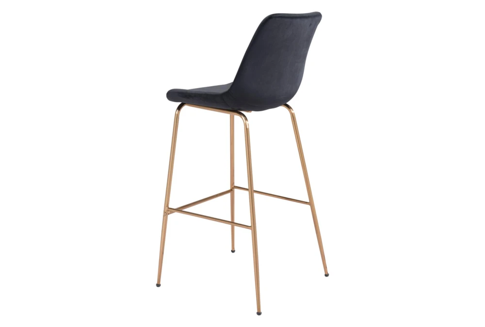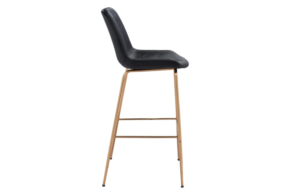 The Black Velvet Bucket Bar Stool is a modern-style metal stool for the dining room, featuring an armless design and a back for added support. Assembly is required and the stool is available in black with gold accents, constructed with steel and foam cushioning upholstered in 100% polyester.