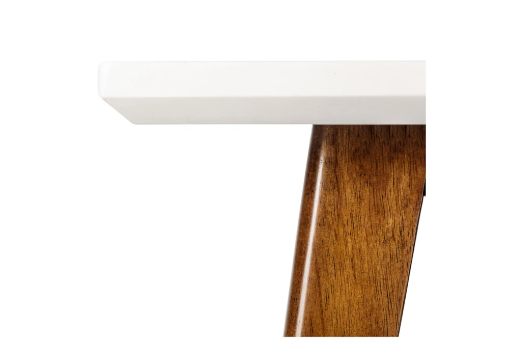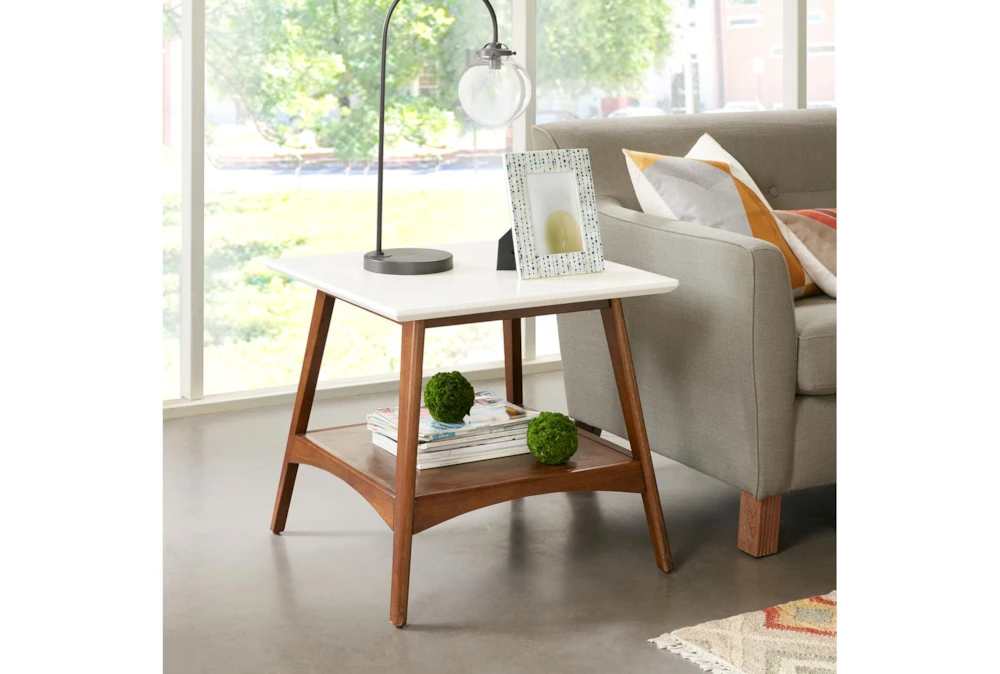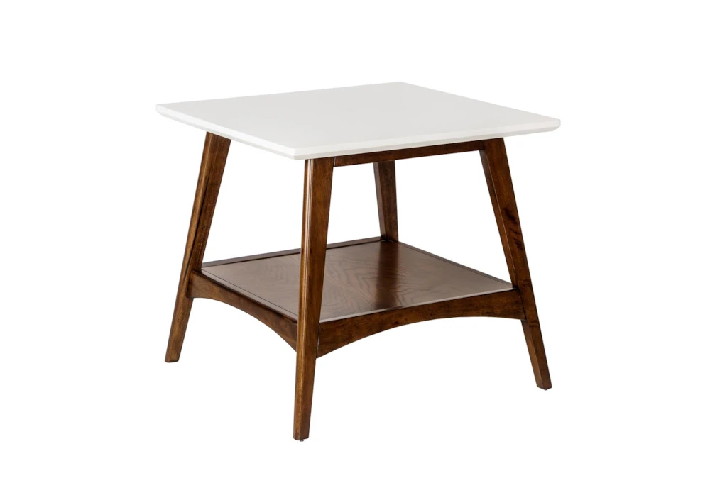 The Blaire End Table is a mid-century modern style table made of a rubberwood frame, MDF top, and oak veneer shelf with a white top and pecan base wood finish. Assembly is required for this stylish addition to your living room.
