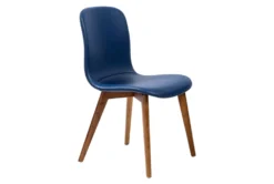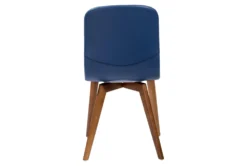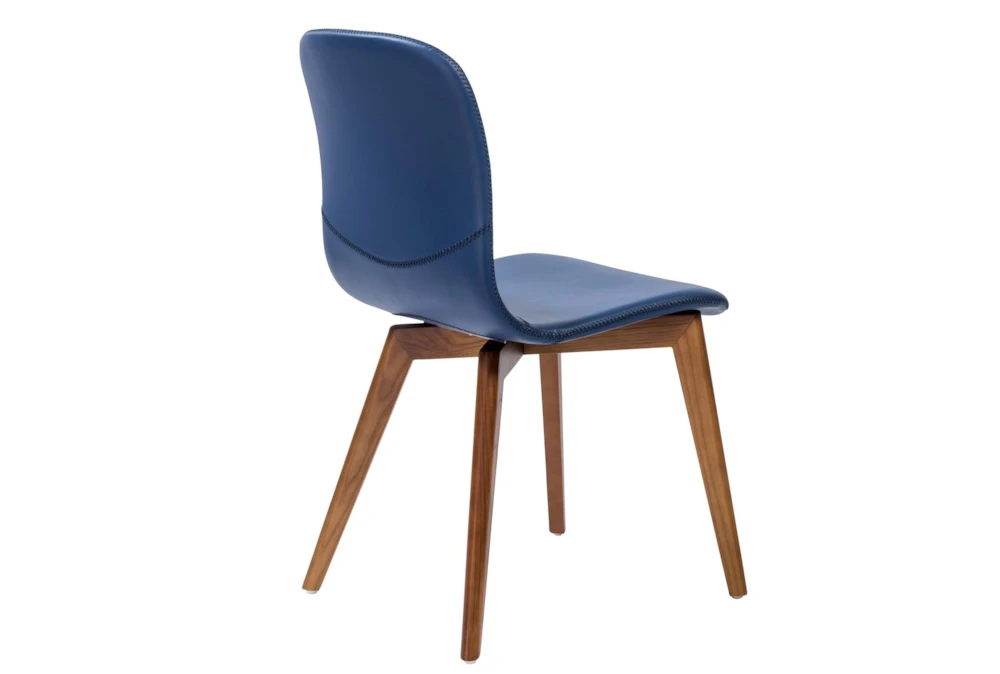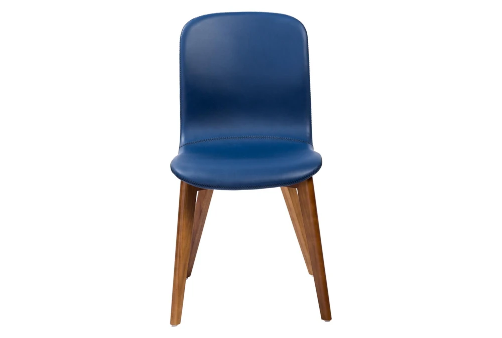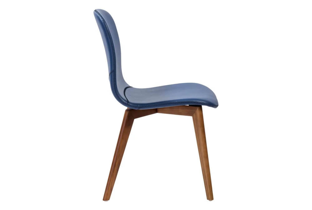This set of 2 modern side chairs features blue faux leather with contrast stitching and walnut legs. Assembly is required.