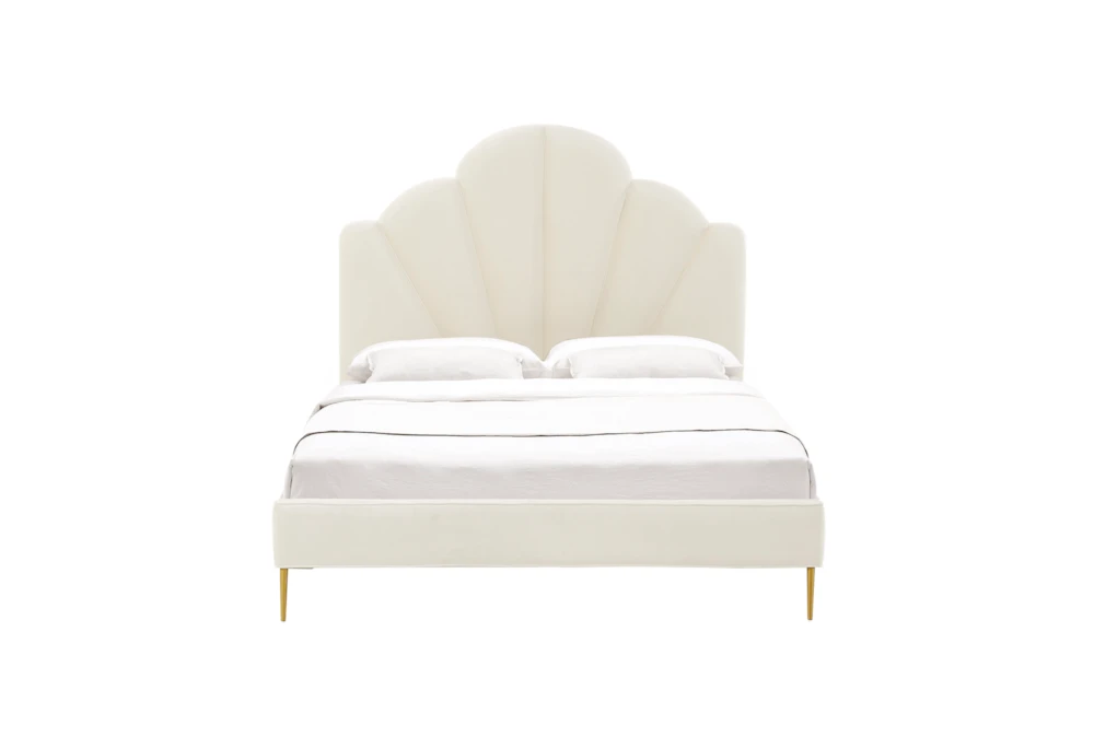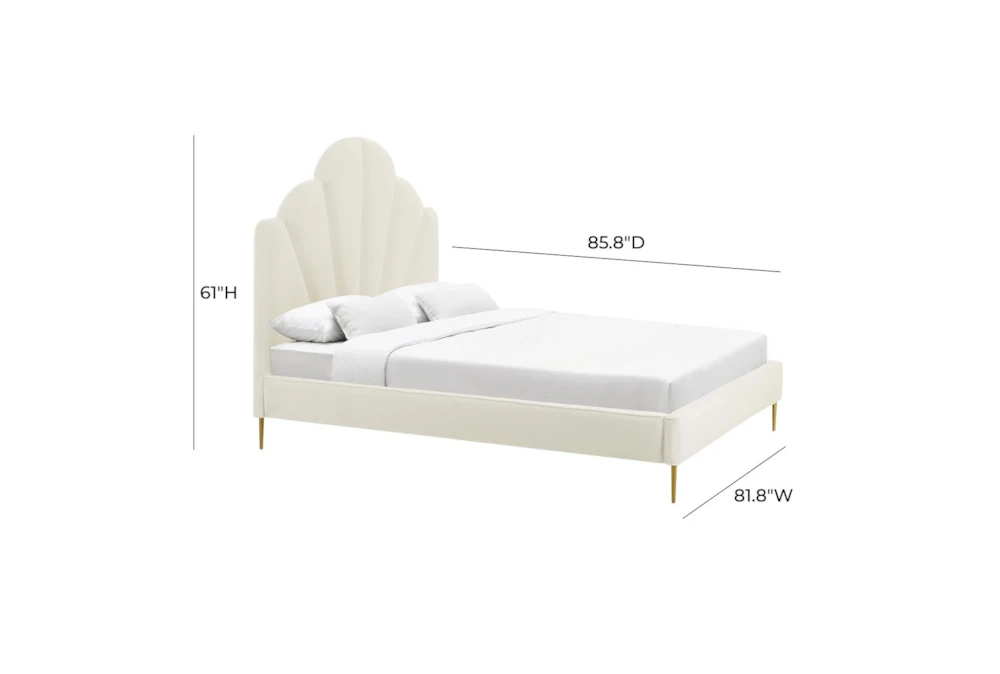 The Bridgette Cream Velvet Platform Bed boasts a modern style with its curved platform design, handmade by skilled furniture craftsmen using pine and luxurious velvet fabric, available in a variety of colors and sizes to fit any bedroom. Its unique shell-like silhouette adds a touch of elegance to any living space.