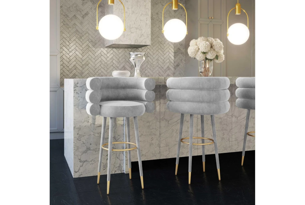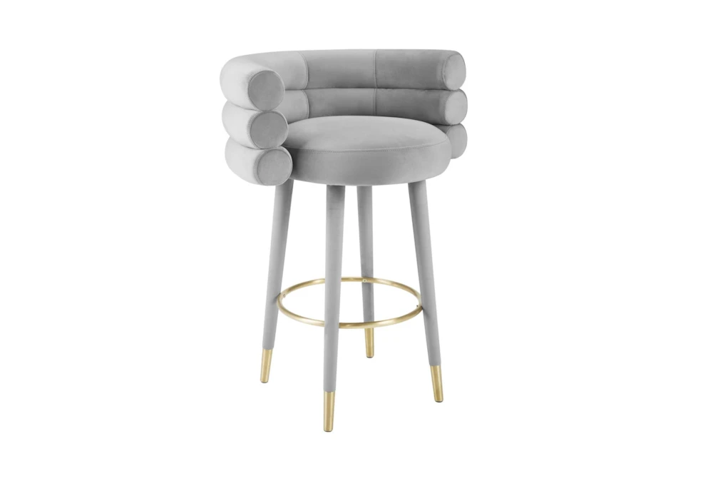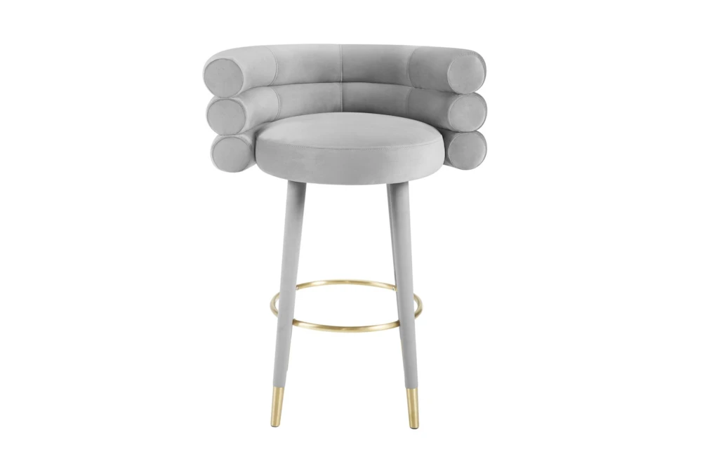 The Brigitte Grey Velvet 30 Inch Barstool is a contemporary style barstool made of fabric and velvet materials, with lavish upholstery available in two different color choices. Assembly is required and the birch legs are tipped with gold stainless-steel. A fabric swatch is also available.