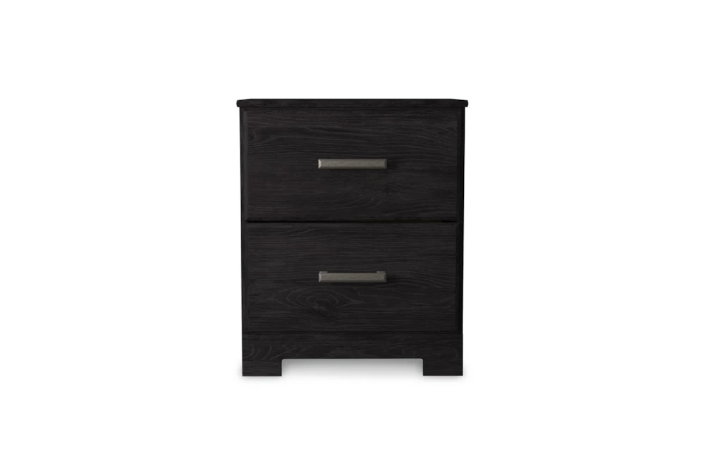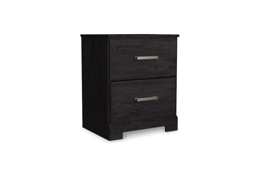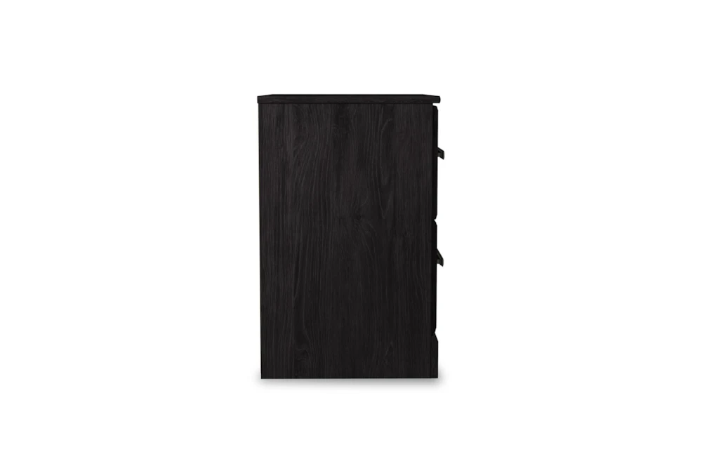 The Bron Black Nightstand is a stylish and functional addition to any bedroom with its two smooth gliding drawers and casual design. Crafted from engineered wood and laminate, it features an antique dark pewter tone handles and a dark charcoal finish over replicated oak grain for a sleek black look.