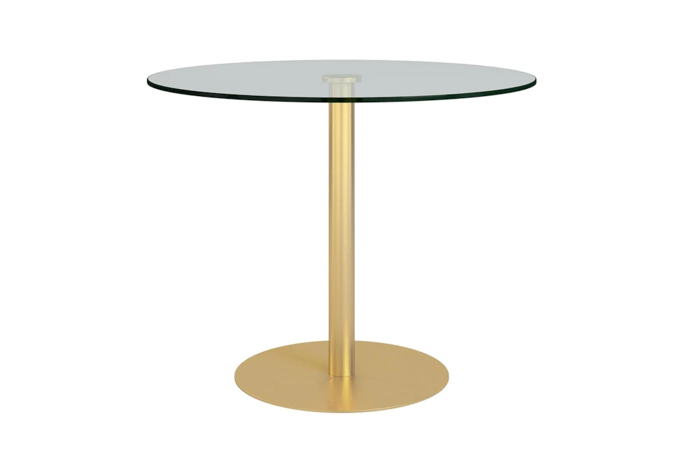 The Cadiz Clear Glass And Matte Brushed Gold 36 Inch Round Bistro Table is a modern piece that features a curved, glass top on a narrow pedestal. The tempered glass top has a pencil polished edge and the steel column and base are finished in matte brushed gold.