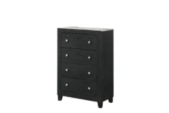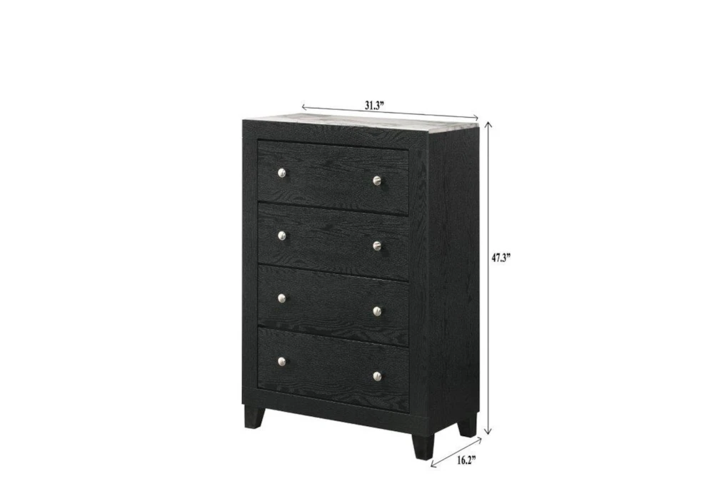 The Cady Black Chest of Drawers is a contemporary addition to any bedroom, made with MDF and featuring a sleek black finish and a luxurious marble top. With four drawers, this chest provides ample storage space for clothing and other items.