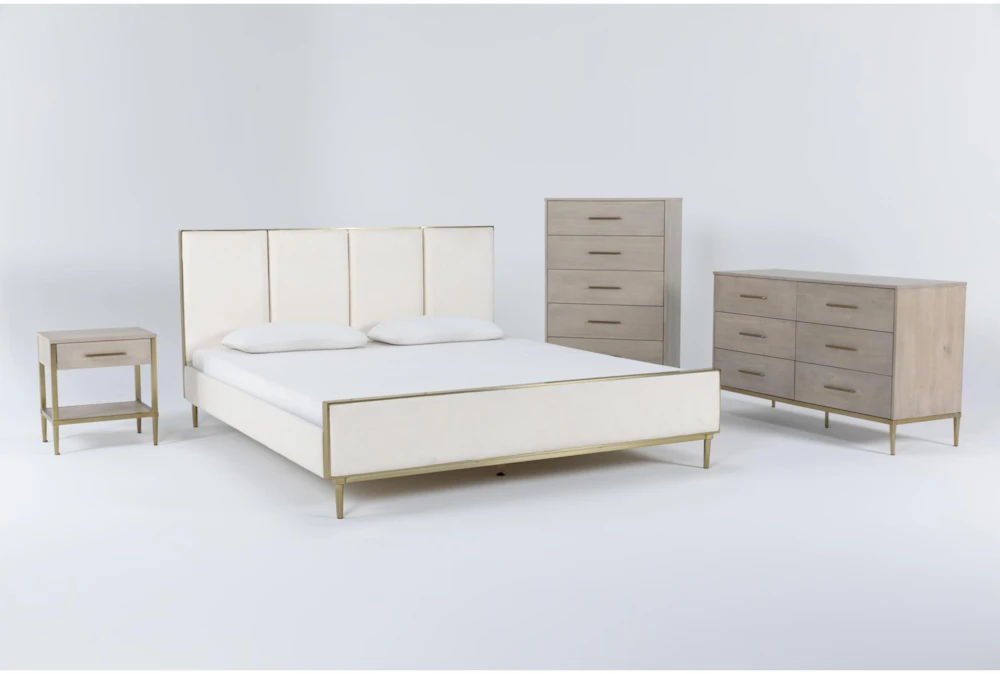 Transform your sanctuary space into a destination for style and relaxation with our Camila bedroom collection. With its abundance of elegant elements, you can create a chic retreat that looks and feels like a luxurious escape. Brass plated details and a velvet upholstered bed with plush paneling bring on the glam, while a cream finish offers a tranquil, trend-forward treat.