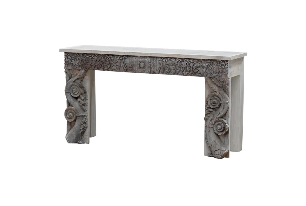 This Carved Whitewash Console exudes rustic charm with its intricate woodwork and whitewashed finish. It is the perfect addition to any home seeking a touch of countryside elegance.