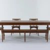 Casual lifestyle design constructed with Acacia veneer and solids. Finished in an antiqued gray wash color. X-back chairs feature solid wood frame and cushioned seat covered with a gray textured polyester fabric with nail head trim. Matching backless bench features nail head trim. D388-113 has storage shelves on one end with a sturdy stretcher. Backless stools with upholstered saddle seat design.