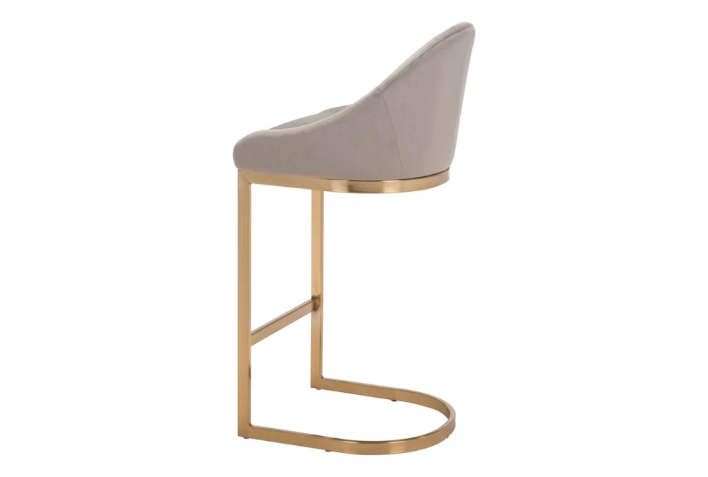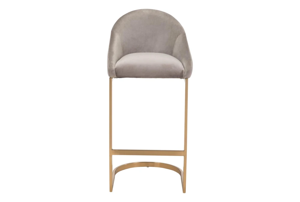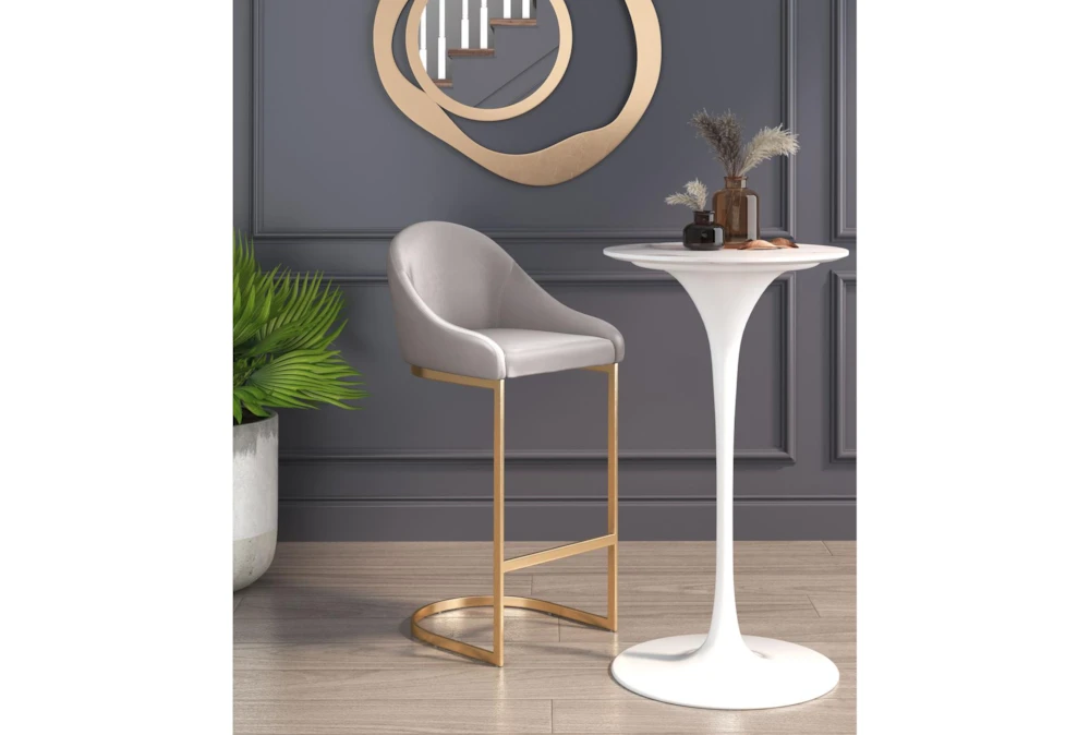 This contemporary grey with gold bar stool is an armless, curved, and backrest-equipped seating option made from steel, plywood, foam, and 100% polyurethane, with gray and gold accents. Assembly is required for this stylish addition to any dining room, with a seating capacity of one and no hanging method required.