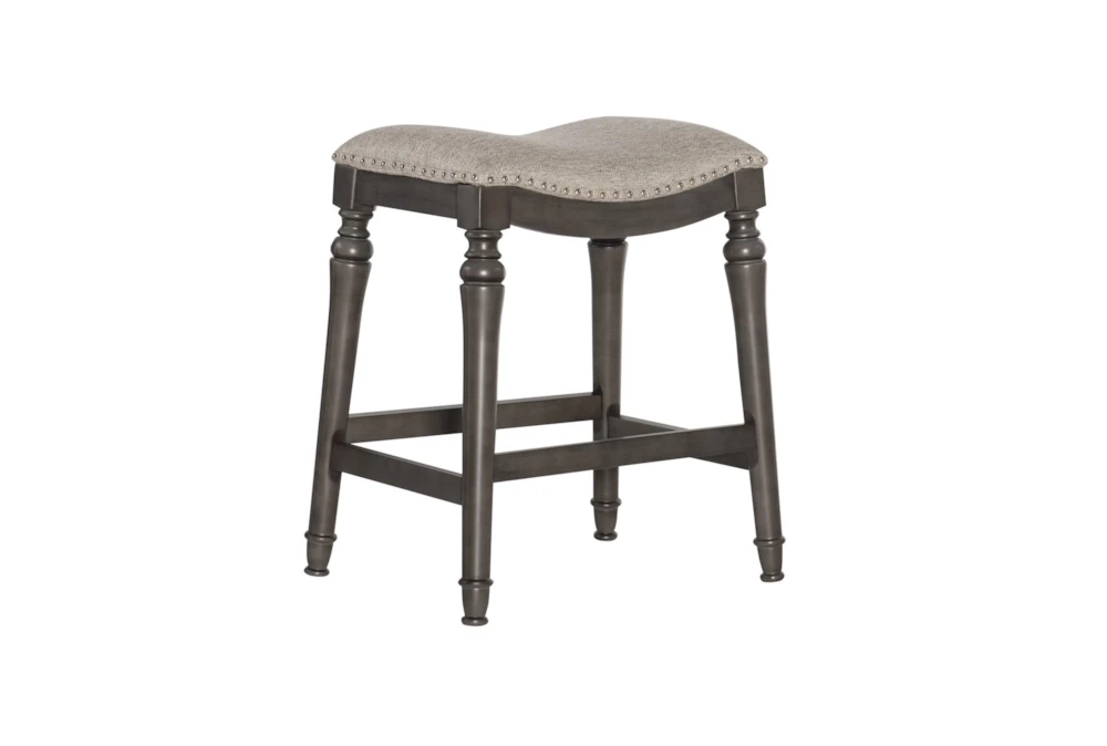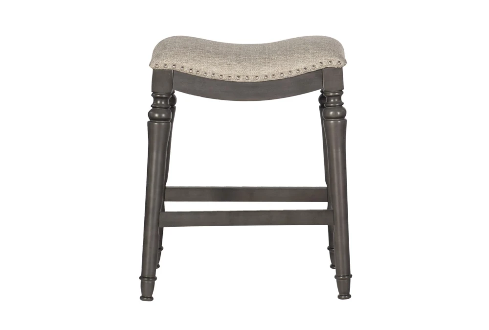The Dale Grey Big And Tall Counter Stool is a traditional style stool made of wood and dolomite, with a backless, oversized design featuring nailhead accents. Assembly is required and the stool comes in a grey color with a cushion made of 80 rubber solid and 5 HW 15 cushion in rubberwood.
