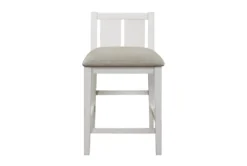The Damar Grey Counter Set for 2 is a casual, armless dining set made of wood and dolomite with a 2-tone finish of gray and white. It features storage, a tall counter height design, and includes a table with a built-in display shelf and USB charging port, as well as 2 chairs.