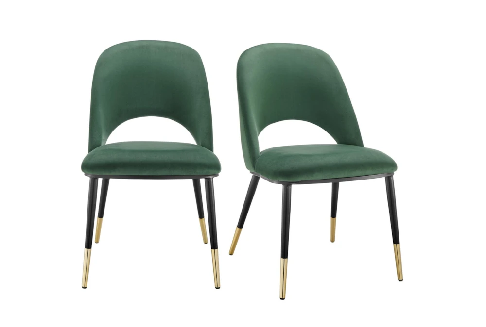 The Darcie Olive Green Velvet Side Chair is a stylish and modern addition to any dining room, featuring a set of 2 armless chairs made of velvet material in a beautiful green color. Assembly is required, and the chairs also feature velvet over foam seats and backs, powder coated steel legs, and plastic feet.