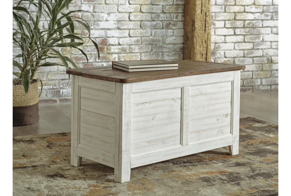 Made of veneer, solide wood, and engineered wood in a distressed white and brown finish. Distressed plank effect on front and sides. Hinged top with storage.