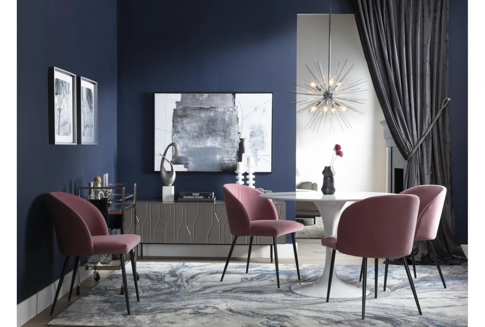 Fashion-forward fabric and a trend-setting silhouette give our Duffy side chairs their distinctive modern flair. Velvety upholstery in pink and grey is soft, stylish and striking, while tapered legs enhance and elevate the design.