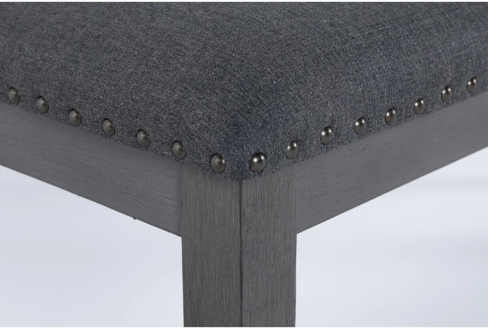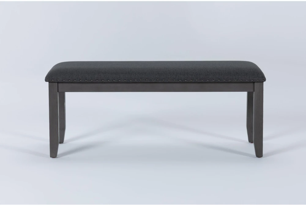 The Eddie Bench is a handcrafted piece of furniture made from a combination of rubberwood and fabric, featuring nailhead accents and tapered legs, perfect for a casual dining room setting. Its narrow design and dark grey color add a touch of sophistication to any space.