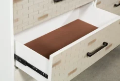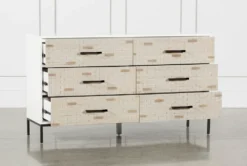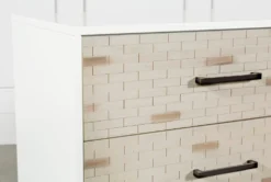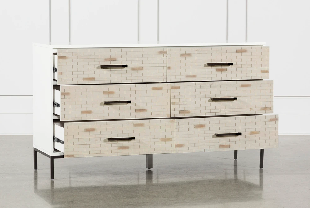 Get an on-trend look for less with our stylish Elden collection. Drawers faced with inlaid acacia veneers bring cool, tiled texture to the solid rubberwood frames in a high-sheen finish. While sleek metal legs and hardware streamline the contemporary design, quality drawer construction ensures sturdy storage. Perfect for mixing and matching with other bedroom furniture, this piece allows you to create a truly custom retreat.