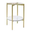 The Elianna End Table is a contemporary piece of furniture with a glass top, made of chrome and clear metal. It is a perfect addition to any living room, with an overall dimension of 19.75″W x 19.75″D x 19.25″H and a weight limit of 110 lbs.