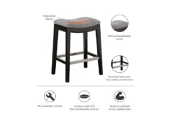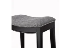 The Ethan Grey 27″ Backless Counter Stool is a tall, assembled stool with a cushion and rustic style, made of fabric and wood. The stool features a select hardwoods and plywood frame, birch legs finished in black noir, and is upholstered with a 70% poly, 20% rayon, and 10% linen blend fabric, filled with high density foam.