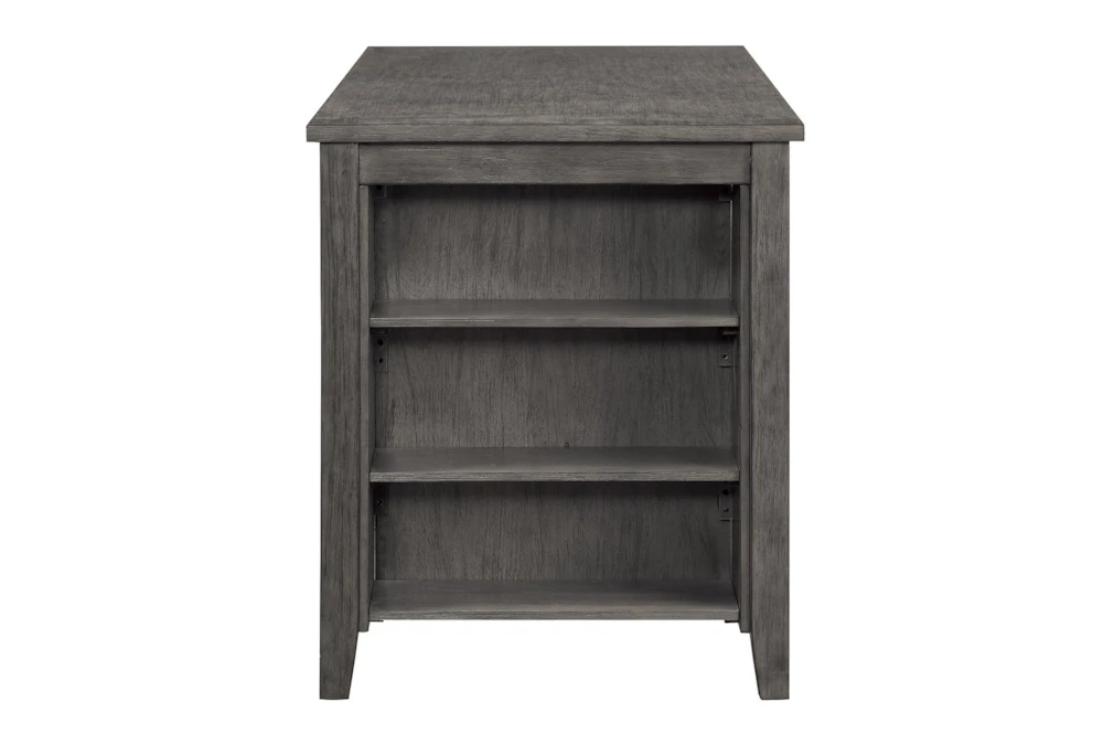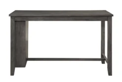 The Fideo Grey Counter Height Table is a rustic piece made of acacia veneer, wood, and engineered wood. It features storage, is tall and portable, and has shelves for added convenience. Assembly is required.