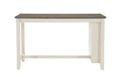 This Fideo White Counter Height Table is a tall, rustic style piece made of wood with Acacia veneer and engineered wood. It features storage shelves and requires assembly.