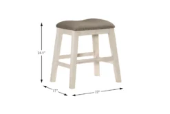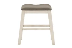 This Fideo White Counter Height Stool Set of 2 is a backless, rustic style stool made of solid wood with an antique white finish and faux leather cushion featuring nailhead detailing and tapered legs. Assembly is required for this set of two stools.