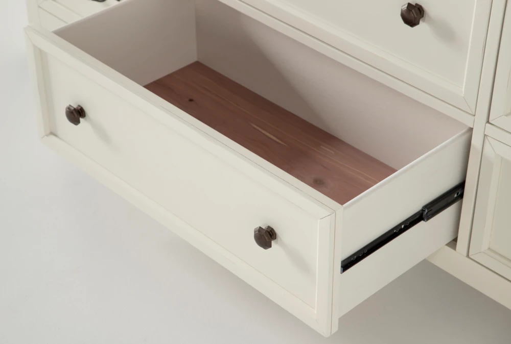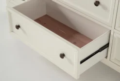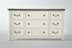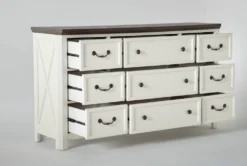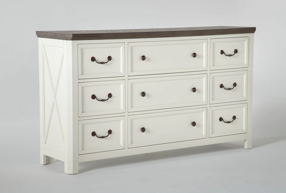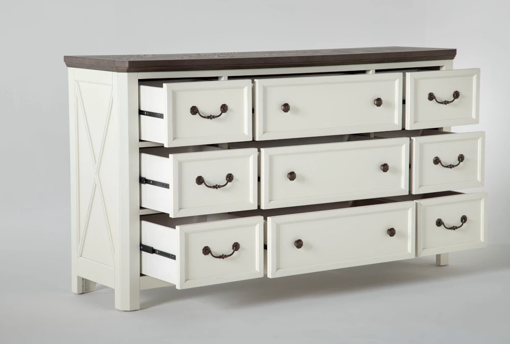 Prepare for things to get cozy in your suite with our Garland dresser. Featuring farmhouse-inspired details, this design brings on the charm. Solid hardwood and oak veneers instill strength and character, while a two-tone finish, x-motif and weathered bronze hardware add a rustic element. Constructed for smooth, simple operation, the drawers boast French and English dovetail joinery and side-mounted, ball-bearing guides.