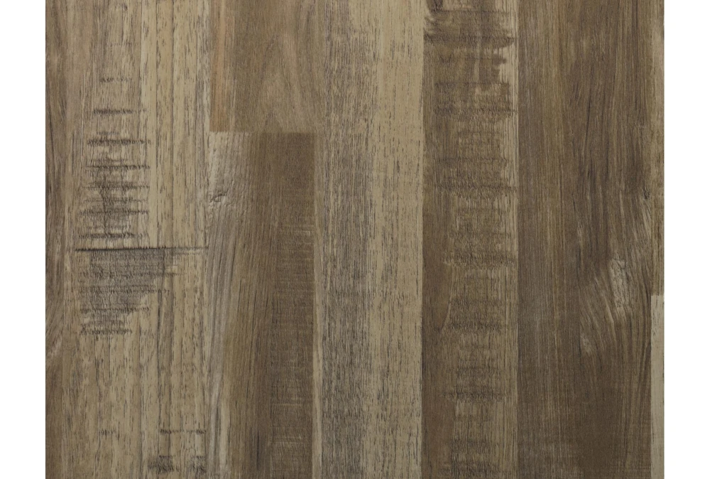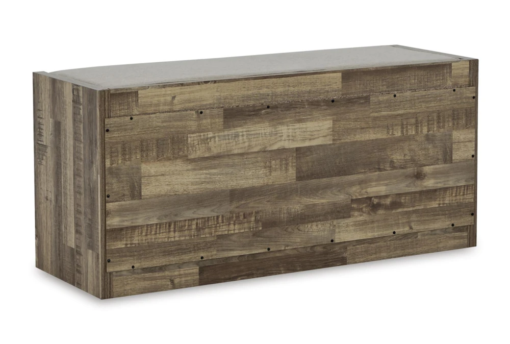 engineered wood, decorative laminate. Butcher block, light brown finish over replicated wood grain. 3 open storage compartments, beige polyester revesible foam cushion