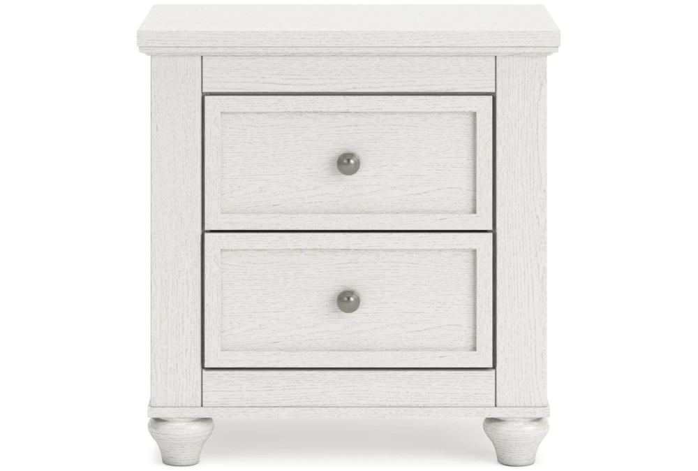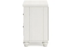 Made of engineered wood & decorative laminate. Soft white finish over replicated wood grain. Satin nickel tone hardware. Side roller glides allow snooth operating drawers. Case pilasters. Framed drawer fronts. Bun feet. USB & QI wireless charging options.