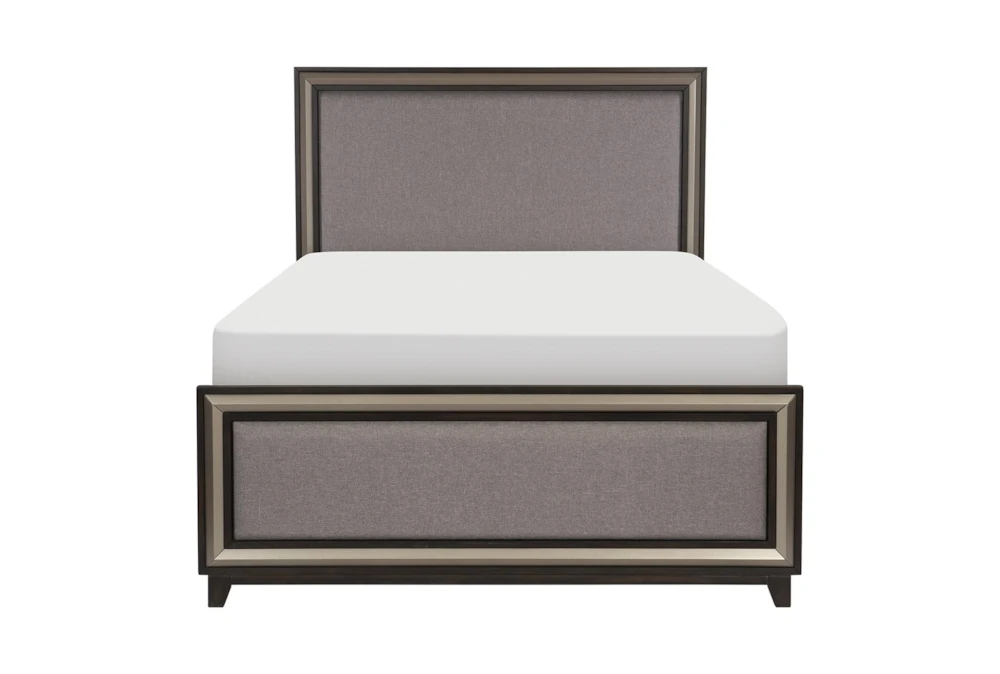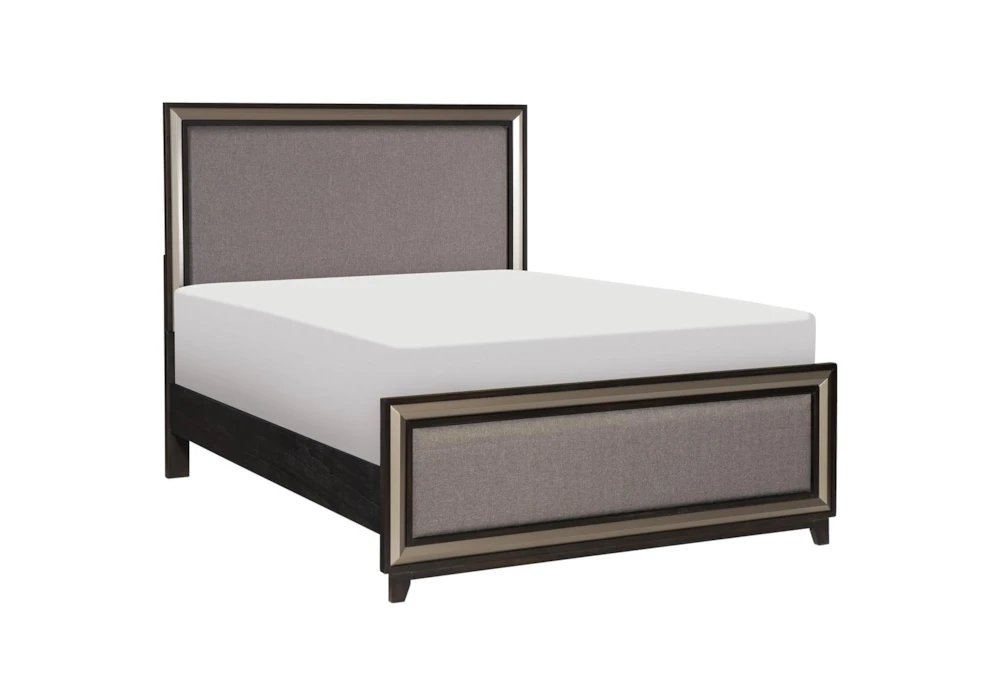 The Gilian Queen Panel Bed is a contemporary style piece of bedroom furniture made with black fabric and wood. Its 2-tone finish features ebony and silver, as well as oak veneer, engineered wood, and Asian hardwood. The upholstered headboard and footboard add comfort and style to any bedroom.