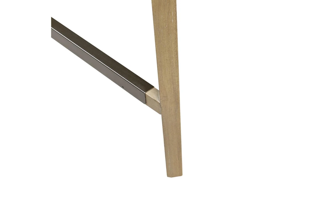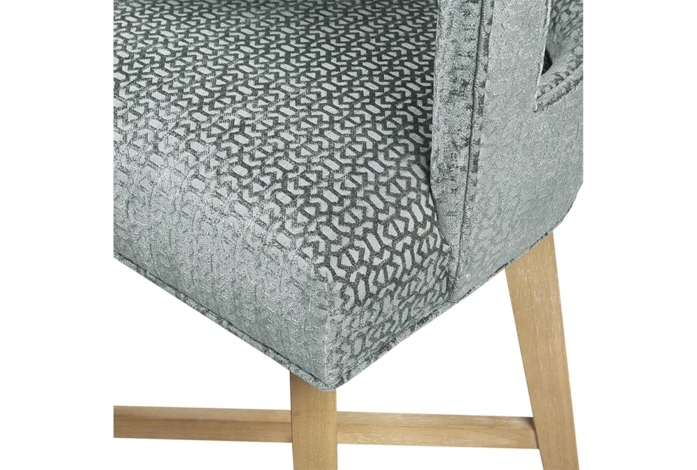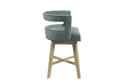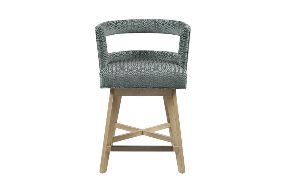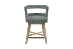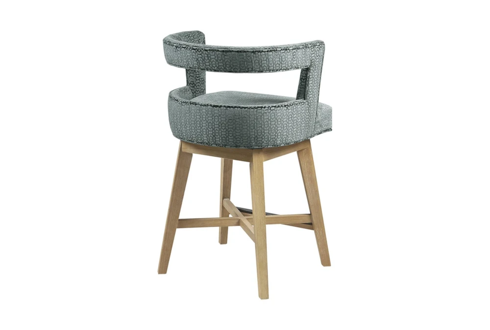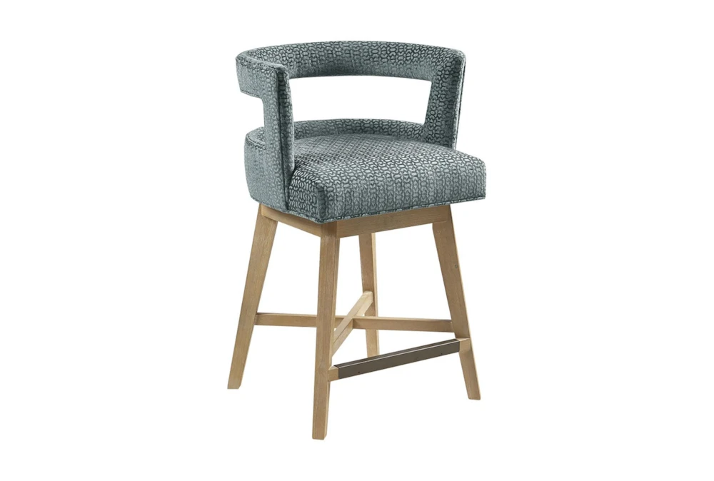 The Glen Blue Swivel Low Back Counter Stool is a tall, modern style counter stool made of solid wood with a blue polyester upholstery and a metal kickplate. Assembly is required and the wheat-colored wood finish has no wire brush texture.