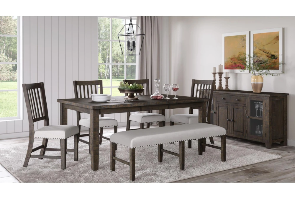 The Graham Dining Set comes with a bench and can seat up to 6 people. It features a slat back design, armless chairs, and nailhead accents.