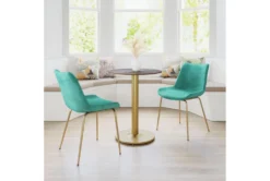 This Green Velvet Bucket Seat Dining Chair Set Of 2 comes with cushions and requires assembly. The modern style chairs are made of metal and fabric, featuring a green velvet color and dimensions of 19.7″ W x 23.2″ D x 31.9″ H.