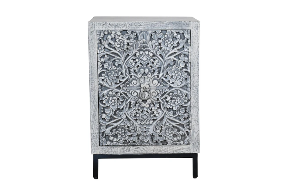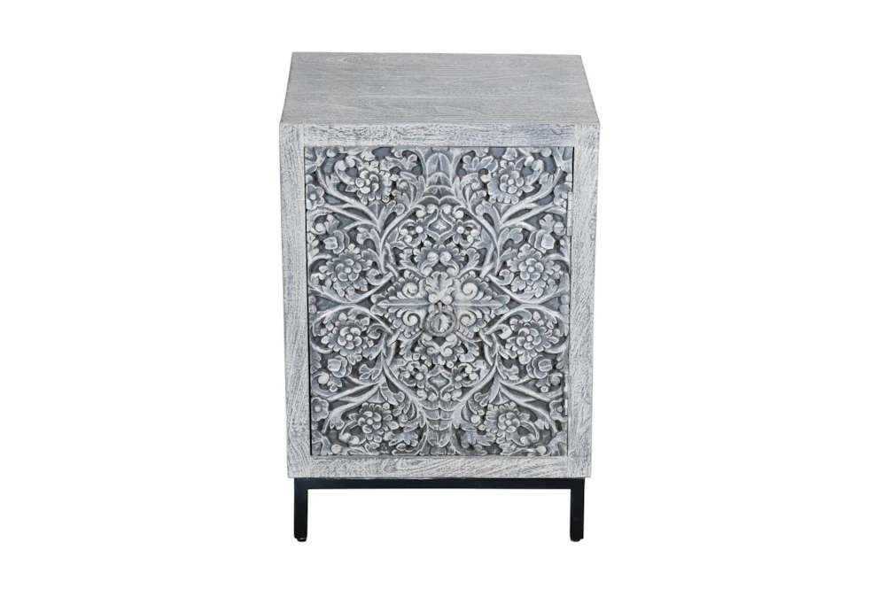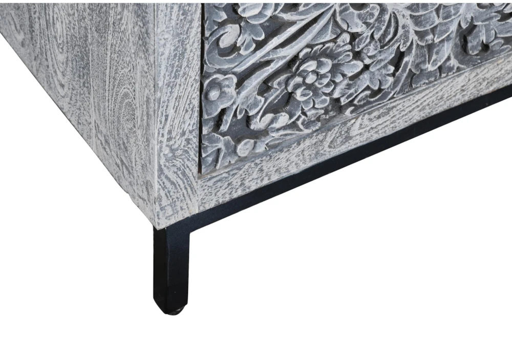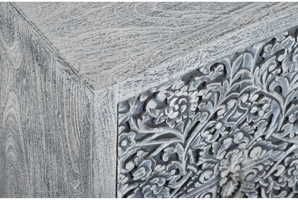 This Grey Carved Wood Accent Table is the perfect addition to any boho-inspired home with its intricate design and modern grey color. With shelves and doors, this table offers both style and functionality, making it a must-have piece for any living space.
