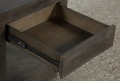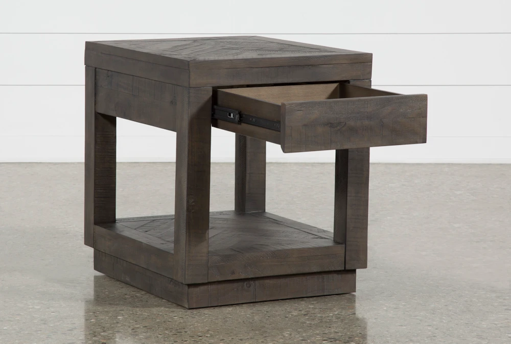 Create a cozy and functional vibe in your living room with our Harrison End Table. A rustic modern design lends for a standout piece in your living environment. A herringbone pattern is crafted by laying rough-hewn, hand-sanded planks of solid pine over plywood. The final touch, a smoke brown finish and heavy glaze combination, hand rubbing and matte lacquer to emphasize the wood’s natural look. A pull-through drawer and built-in shelf add extra storage space.